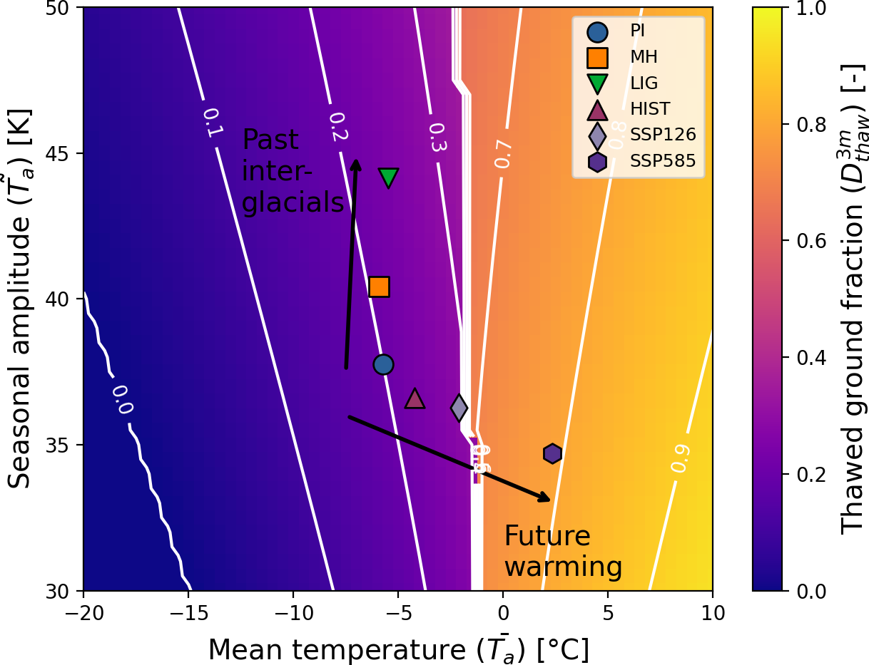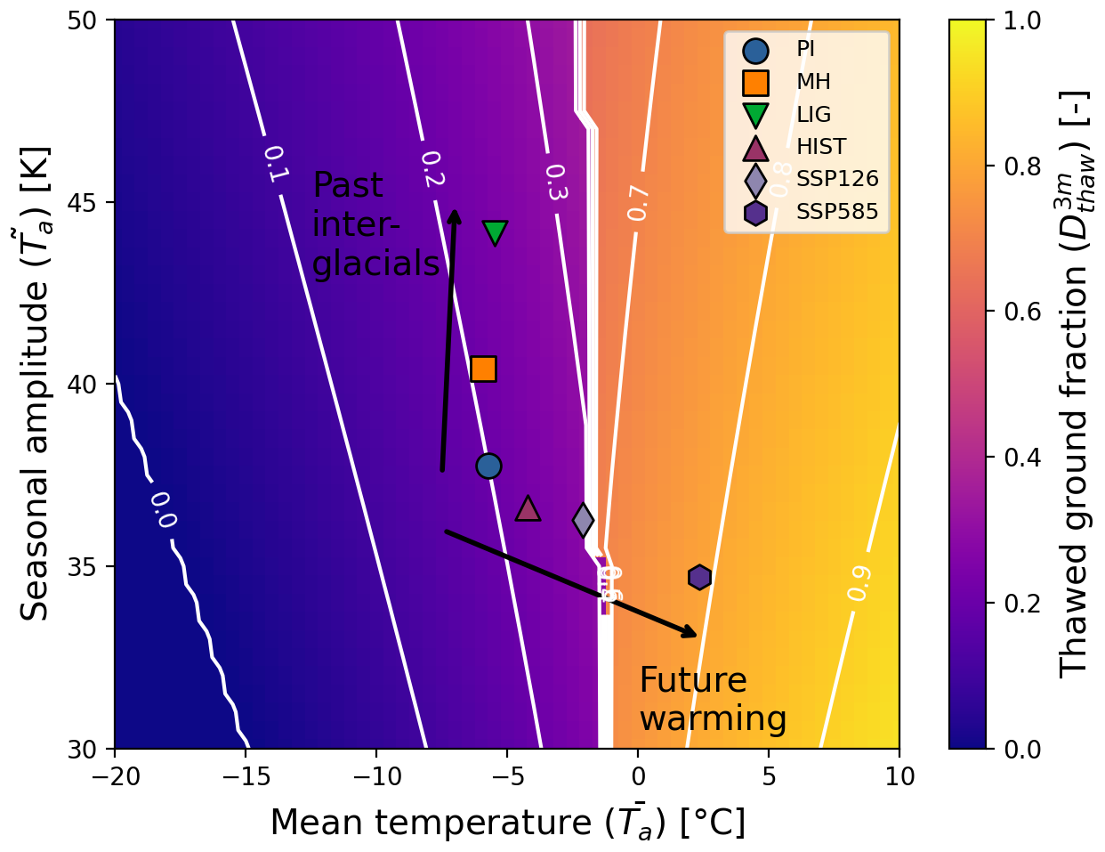 For this, we diagnose parameter-ensemble simulations of the dedicated permafrost model CryoGridLite (Langer et al., 2024) which are driven by climatic forcing time series of different means and seasonal amplitudes of surface temperatures, generated from the output of the fully coupled Earth system model (ESM) AWI-ESM-2.5 (Shi et al., 2022). To provide a perspective on potential future thaw trajectories, we contextualize our findings for the interglacial climates with model simulations of different future climate scenarios.