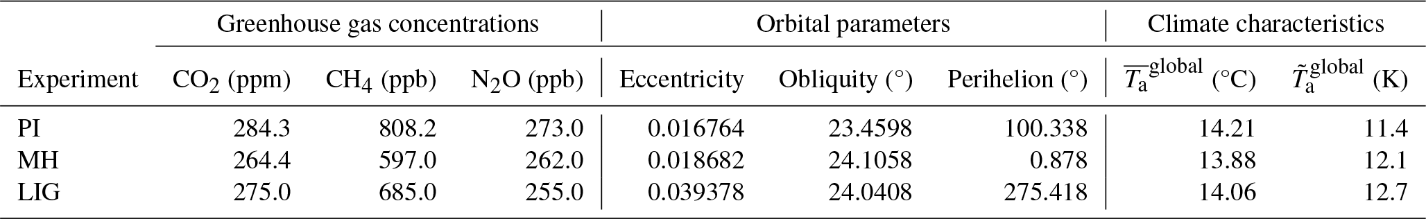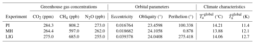 Table 1Greenhouse gas concentrations and orbital parameters used as boundary conditions for the AWI-ESM-2.5 experiments, following the PMIP4 protocol (Otto-Bliesner et al., 2017). Global-mean surface temperature () and global-mean surface temperature seasonality () are shown as well.