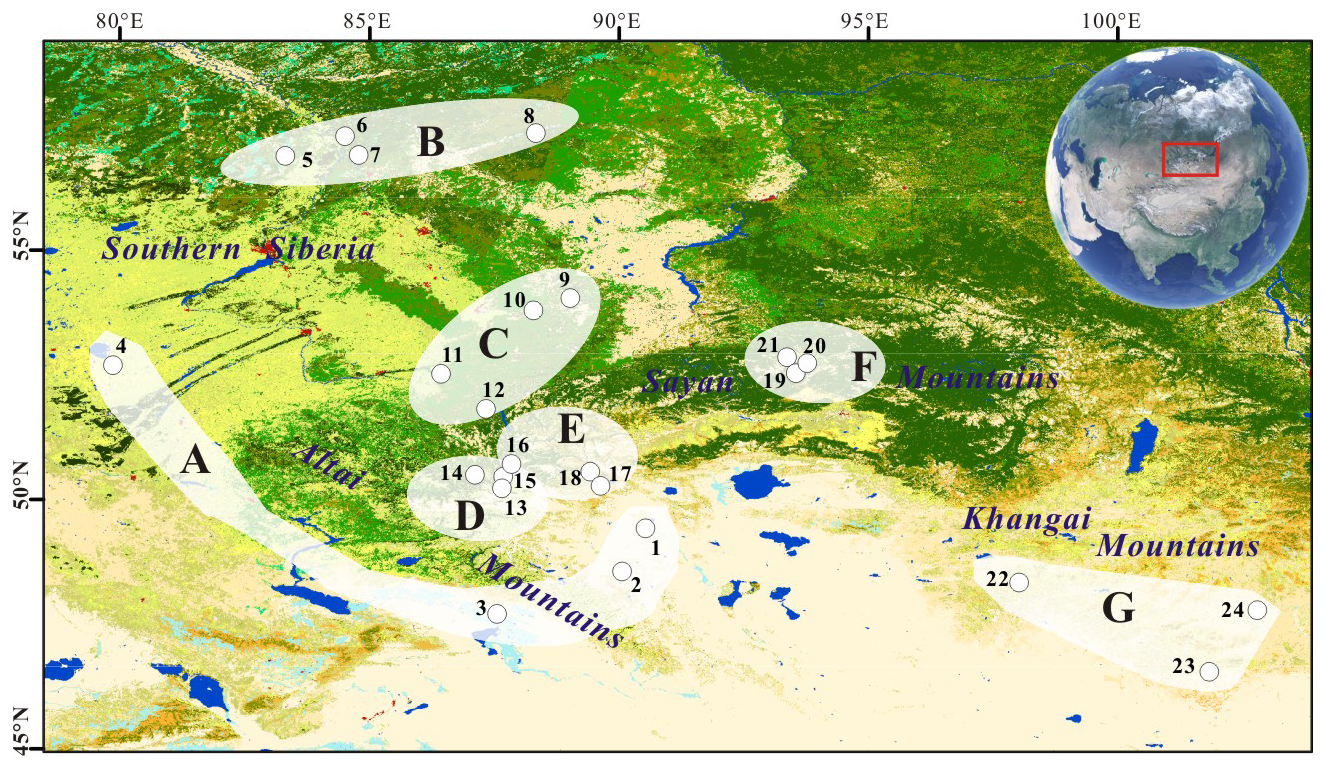 Figure 1Spatial distributions of the selected fossil pollen/charcoal sequences across the Altai-Sayan Mountains and adjacent plains. Region A: Achit Nuur (1), Tolbo Lake (2), Alahake Lake (3) and Kuchuk Lake (4); Region B: Rybnaya Mire (5), Plotnikovo Mire (6), Shchuchye Lake (7) and Ulukh–Chayakh Mire (8); Region C: Chudnoye Mire (9), Tundra Mire (10), Mokhovoe Bog (11) and Kuatang Mire (12); Region D: Dzhangyskol Lake (13), Uzunkol Lake (14) and Kendegelukol Lake (15); Region E: Tashkol Lake (16), Akkol Lake (17) and Grusha Lake (18); Region F: Buibinskoye Mire (19), Bezrybnoye Mire (20) and Lugovoe Peat (21); Region G: Olgi Lake (OL3) (22), Shireet Naiman Nuur (23) and Uggi Nuur (24).