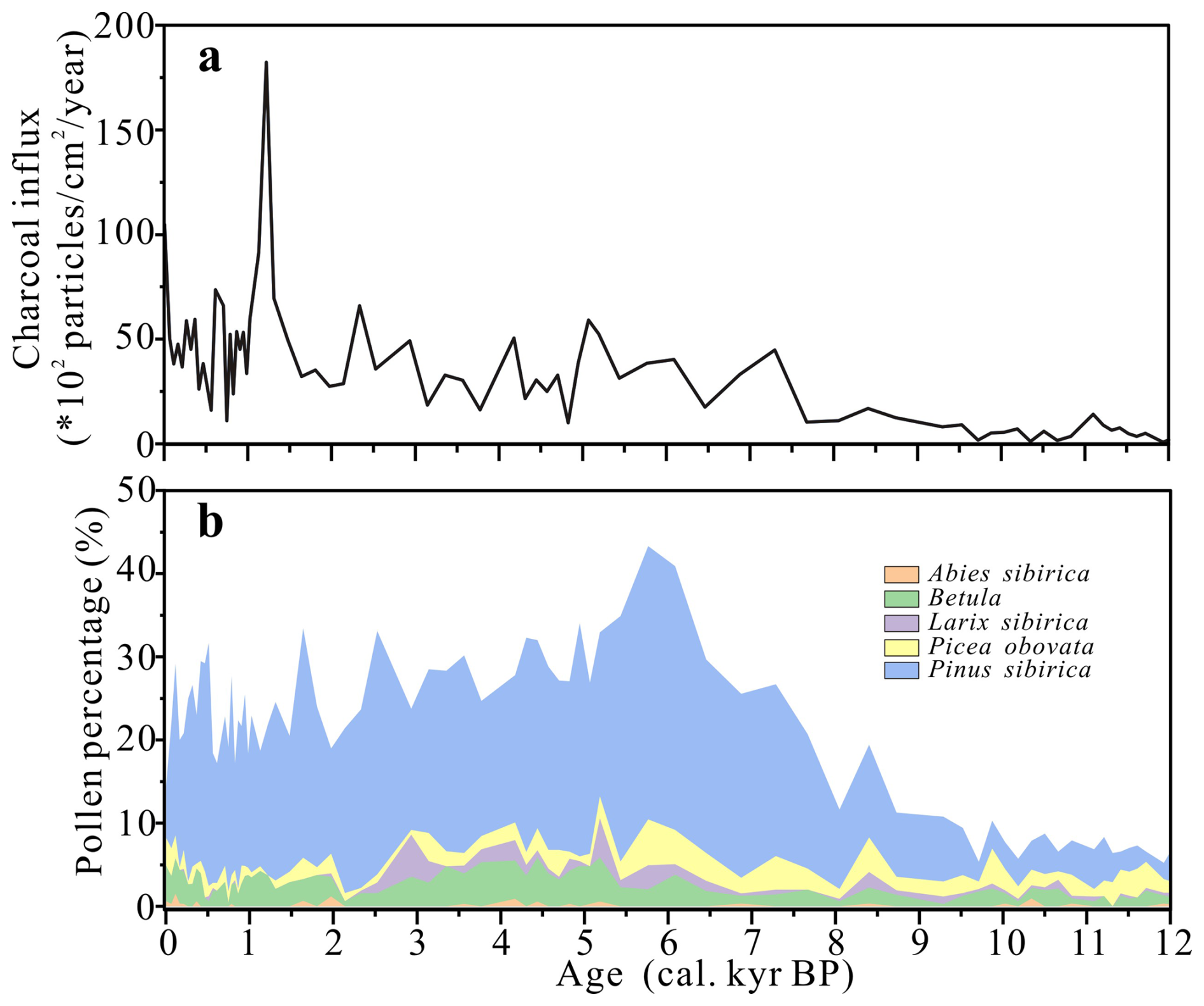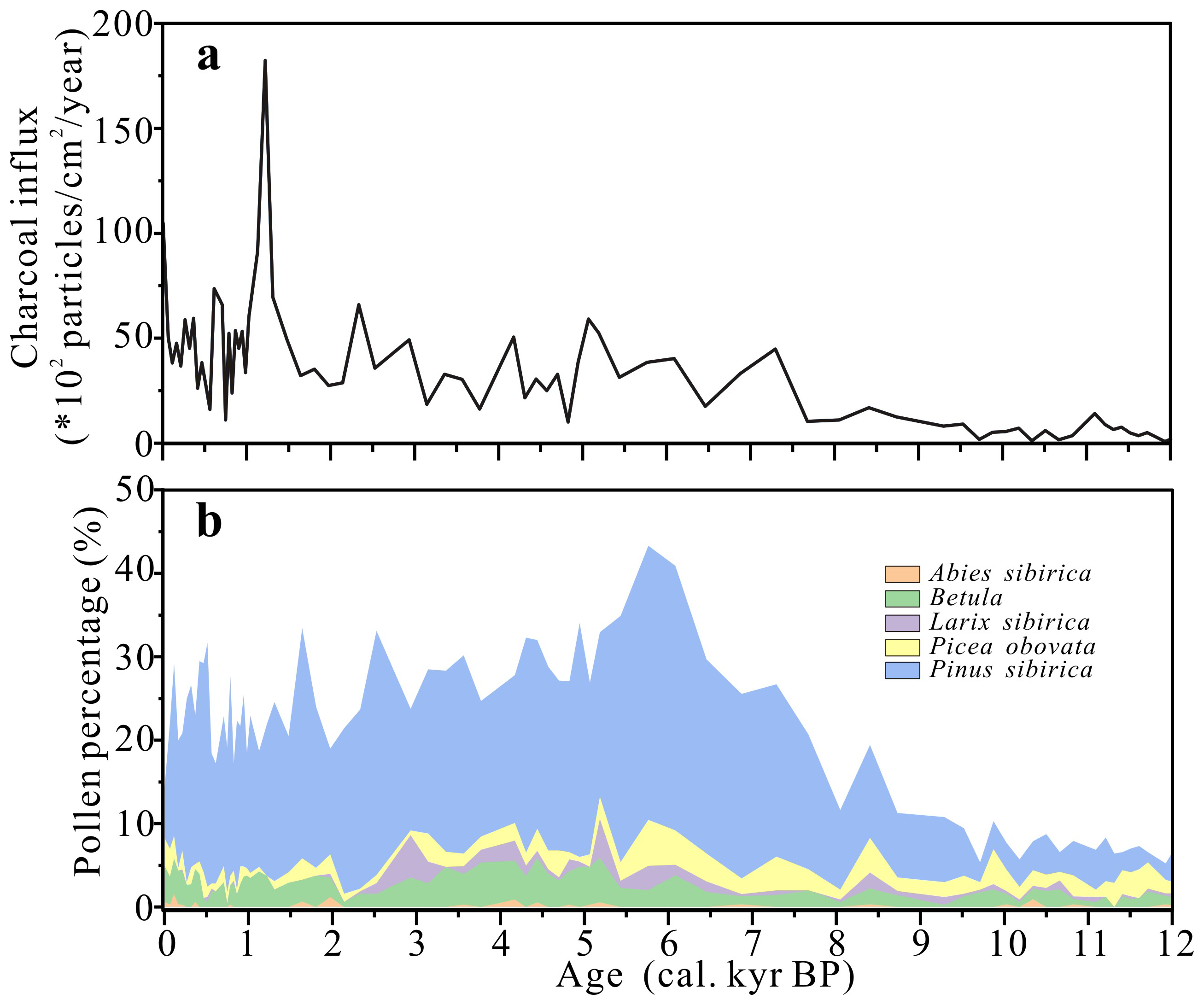 Kuatang Lake shows a clear charcoal increase between  3.5 and  2 cal. kyr BP (Figs. 4d, S4). A distinct vegetation-fire pattern emerges here: charcoal influx positively correlated with Betula pollen but negatively with Abies, P. sibirica and P. sylvestris. This suggests that the post-3.5 cal. kyr BP fire increase was driven by the expansion of fire-prone Betula (thin, volatile bark) at the expense of more fire- resistant conifers (thick bark, dense canopies) (Blyakharchuk et al., 2024).