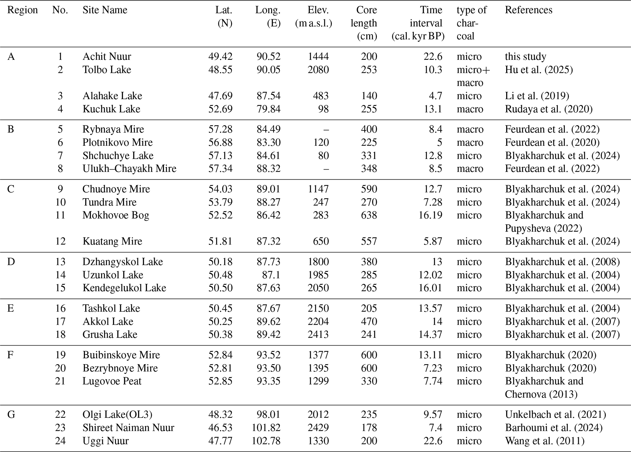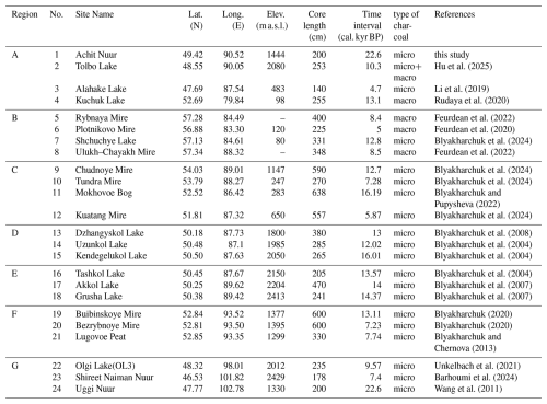 Hu, Y., Huang, X., Li, Y., Chen, H., Demberel, O., Zhang, J., and Xiao, J.: Holocene fire dynamics in the Altai Mountains and its driving factors, Geophys. Res. Lett., 52, e2025GL116309, https://doi.org/10.1029/2025GL116309, 2025.