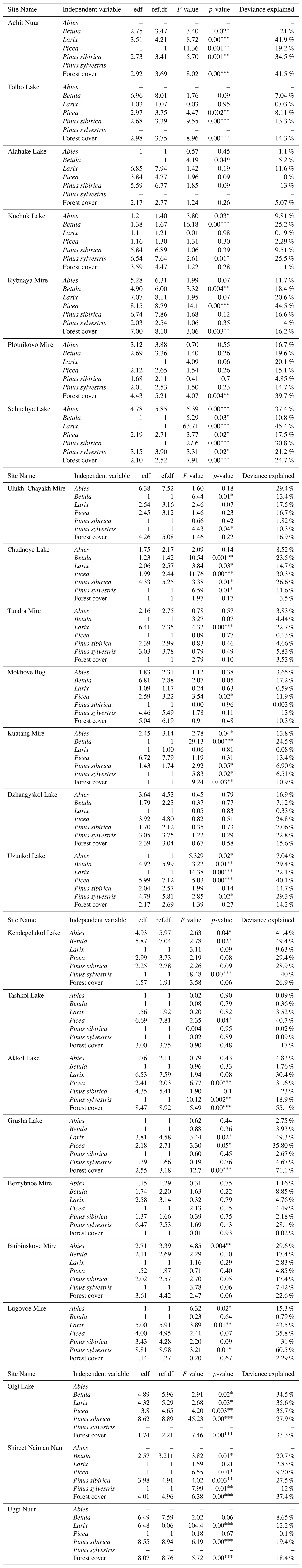 The charcoal influx in Achit Nuur varies from 67 to 2643 particles cm−2 yr−1 with an average of 501 particles cm−2 yr−1. Notably, higher charcoal influx has been recorded since  2 cal. kyr BP with the maximum occurring during the interval of  1.2– 0.79 cal. kyr BP (Fig. 3a). Regarding pollen trends: P. sibirica, Betula and Picea exhibited a rapid increase before  6 cal. kyr BP, followed by a gradual decreasing trend (Fig. 3b) (Sun et al., 2013). High Larix pollen content was observed from  6 to  2 cal. kyr BP, while Abies pollen remained relatively low throughout the entire sequence. GAMs analyses reveal charcoal influx is significantly positively correlated with the abundance of Betula (Deviance explained =20 %, p=0.02), P. sibirica (Deviance explained =34.5 %, p=0.001) and total forest cover (Deviance explained =41.5 %, p<0.001). Conversely, it is significantly negatively correlated with decreasing Larix (Deviance explained =41.9 %, p<0.001) and Picea (Deviance explained =19.2 %, p=0.001) abundances (Table 2, Fig. 1).