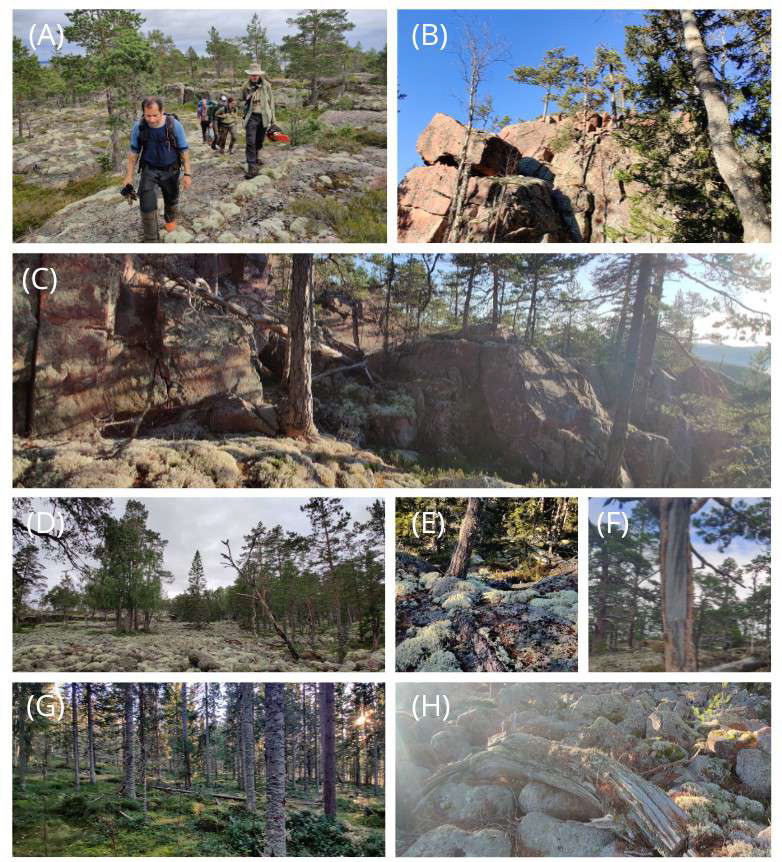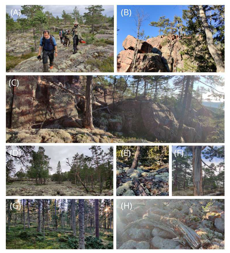 Figure 2(A–C) Typical terrain on the higher parts of the sampling area, with thin soil cover where mainly Scots pine trees thrive. (D) Raised shingle field formed by wave action when the shoreline was at higher level, now located about 50–100 m above the present sea level. The pines that grow here can be relatively large and reach a remarkable age. Here the trees tend to grow in patches, which likely helps protect them from the recurring fires evident throughout the area. The oldest living tree here is well over 600 years old. (E) A small pine tree with thick roots that run across the bedrock to moister terrain. In this rocky terrain, it is not uncommon to see exposed roots nearly as thick as the stem itself. (F) Fire scars are often easily visible on both living trees and deadwood. (G) In one of the valleys just below the site, soil conditions are much wetter, supporting a relatively fast-growing spruce-dominated forest. (H) Example of deadwood found on the raised beach. In this dry environment, wood from pine can remain well-preserved for hundreds of years after falling. The sapwood tends to disintegrate relatively quickly, and in the older specimens, parts of the heartwood can also be missing.