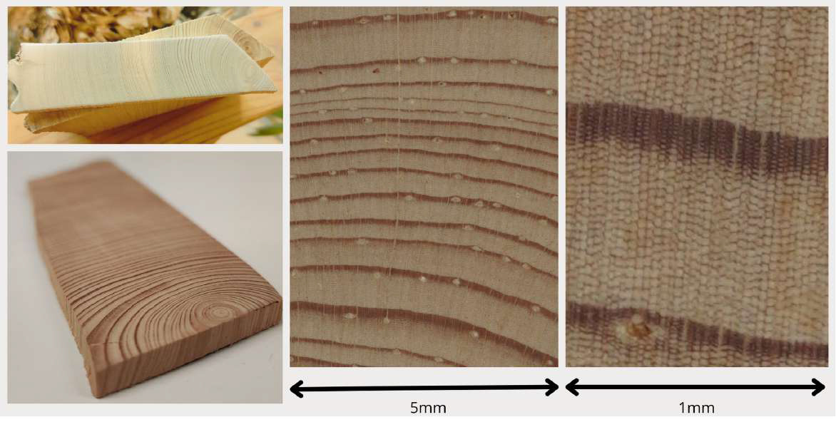 The samples were washed in 96 % ethanol using a Soxhlet extractor for at least 48 h, or until they no longer discoloured the solvent. The deadwood samples were sawn into slices approximately 4 mm thick before washing. The samples were then sanded with progressively finer sandpaper up to 800 grit. Digital images of the samples were taken using the Skippy image-capturing system (Gärtner et al., 2024), integrated with a Sony Alpha 7R IV 61-megapixel camera, capable of producing images at resolutions up to 6000 dpi. At this resolution, well-prepared wood samples in good condition, allow for the distinction between cell walls and the lumen. Figure 3 shows a section cut from a disk of deadwood where the heartwood has remained in excellent condition despite many centuries on the ground. Note the abundance of resin ducts, which is typical of the pine wood from this site. Tree-ring width (TRW) measurements were conducted with CooRecorder (version 9.4; Larsson, 2014) and cross-dated using CDendro (Larsson, 2014) and COFECHA (Holmes, 1983). In addition to TRW, earlywood and latewood widths were also measured. Although these parameters were not incorporated into the final precipitation reconstruction, they were retained for use in the climate–growth relationship analysis.