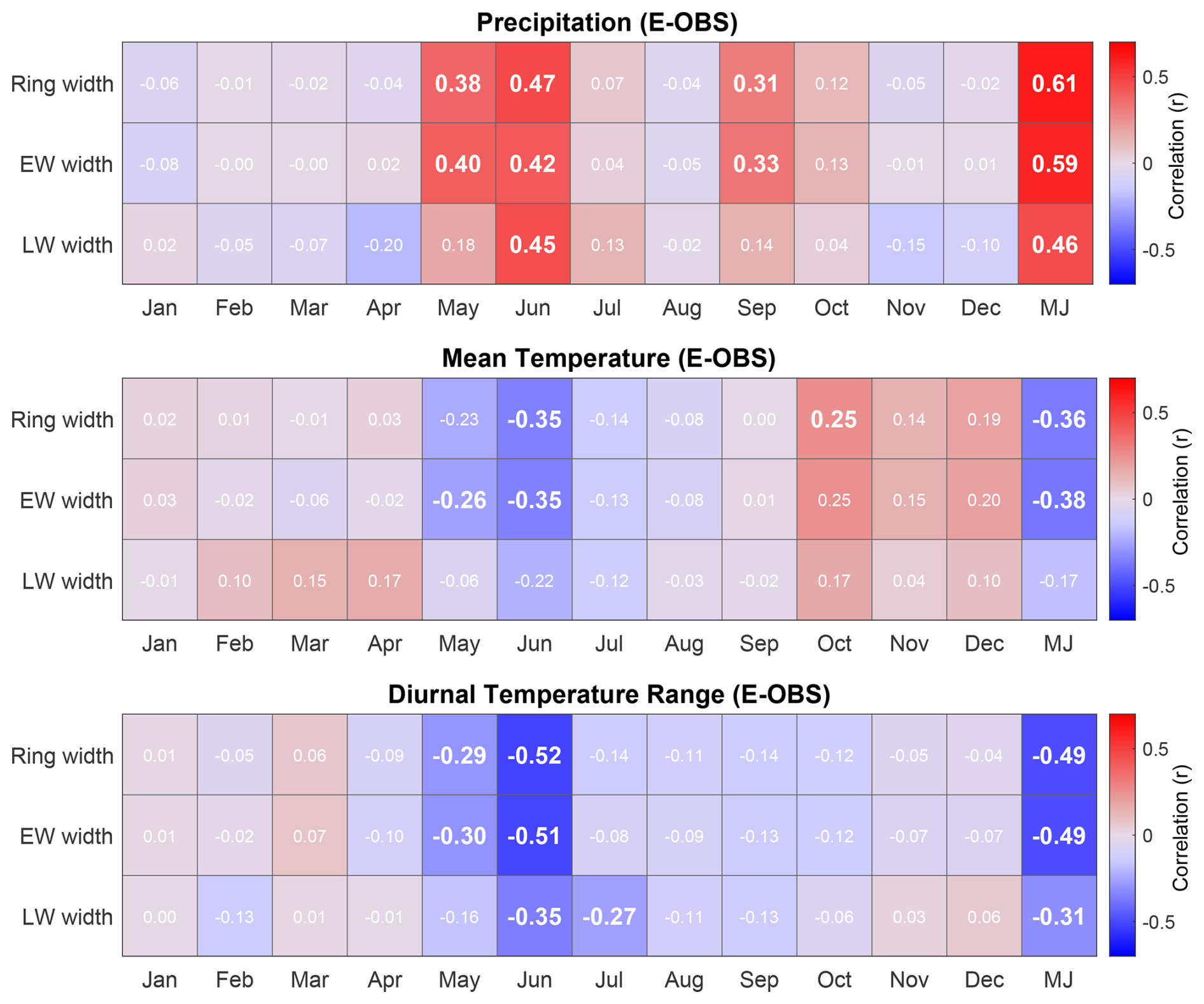 Figure 6Monthly Pearson correlations between the different ring width components and precipitation, mean temperature, diurnal temperature range using the E-OBS dataset for the 1920–2021 period. The ring width components are earlywood (EW) width, latewood (LW) width as well as the full ring width. Both the climate data and the ring width data have been detrended with a 30-years spline prior to correlation analysis. Statistically significant correlations (P<0.01) are highlighted in bold.