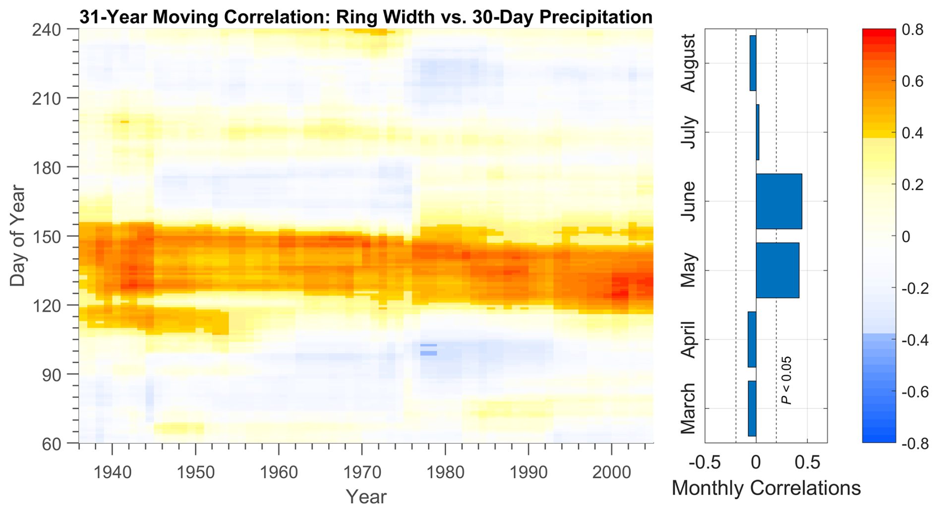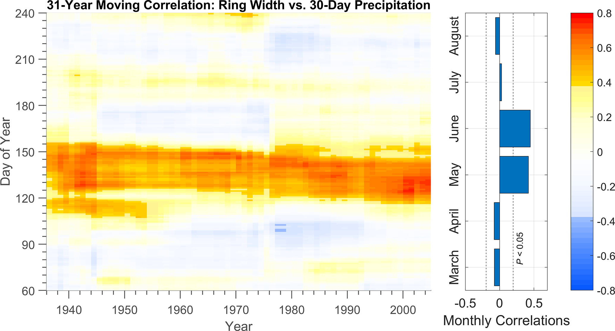 Figure 7Running 31-year correlation (Pearson) between tree-ring width and 30 d precipitation totals from the Härnösand meteorological station for the period 1920–2021. The y-axis (Day of Year) corresponds to the start date of each 30 d window. Insignificant correlations (P>0.05) are displayed in pale colours. The bar chart displays monthly correlations for the entire 1920–2021 period, the dotted line indicates a significant correlation for the entire 102-years period. The climate data and the chronology have been detrended with a 30-year spline prior to correlation analysis.