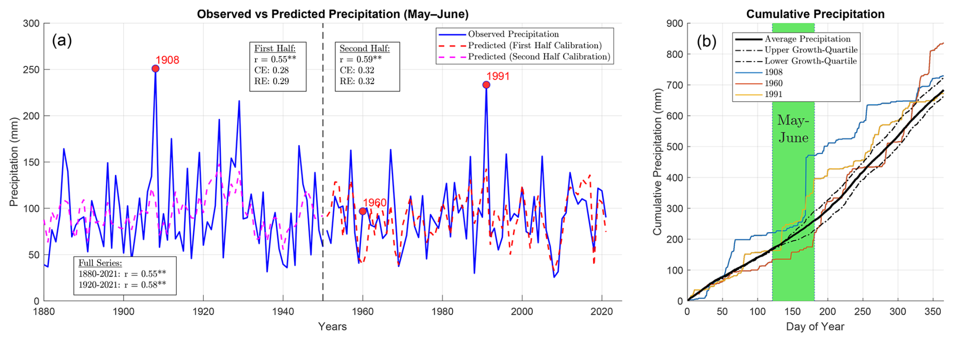 Figure 8(a) Calibration and validation of the model for May–June precipitation. The 1880–2021 period is divided into two segments (1880–1950 and 1951–2021), with linear regressions fitted to each period. The blue line represents observed precipitation, while the dashed line shows reconstructed values based on the linear regression model from the other half period. The model's performance is evaluated using the Coefficient of Efficiency (CE), Reduction of Error (RE), and Pearson correlation (r) statistics between observed and modelled precipitation. (b) Mean cumulative precipitation over the year, alongside three specific years (1908, 1960 and 1991) where observed precipitation substantially exceeded model predictions. These years are characterized by dry spells during spring, with much of the May–June precipitation occurring in short, intense events. This is especially evident in 1908, when 187 mm of precipitation was recorded on 17 June alone. Mean precipitation for years with fast and slow growth (corresponding to the upper and lower quartiles) is represented with dashed lines.