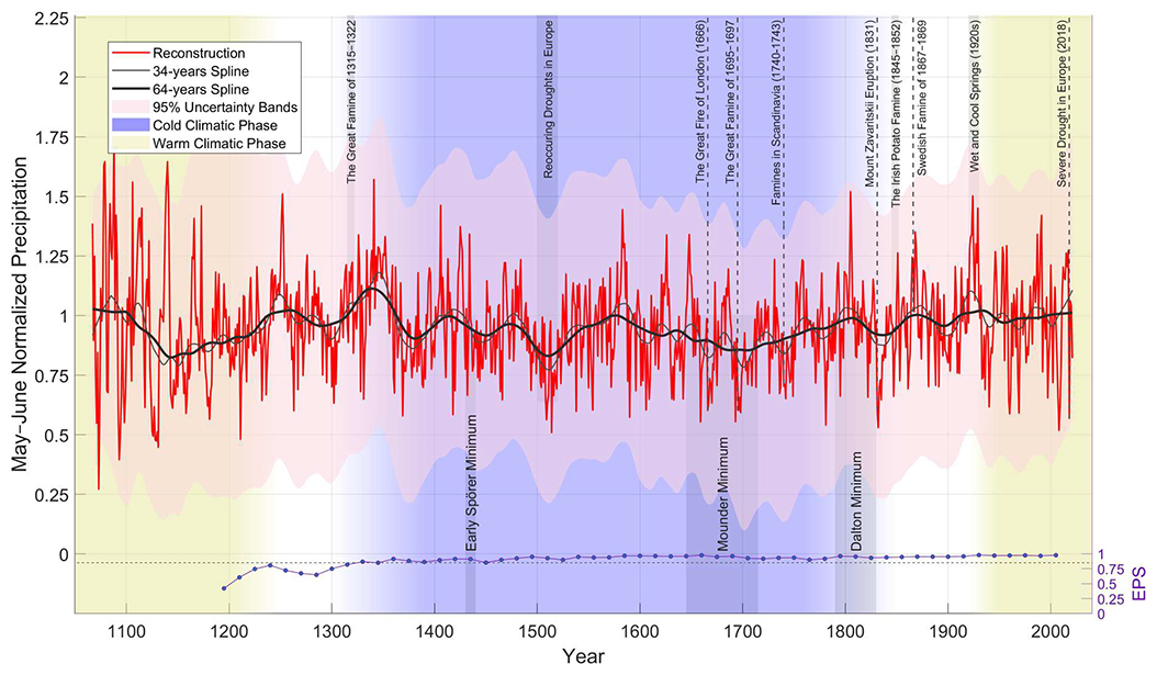 Figure 9Total May–June precipitation reconstruction based on the mRCS chronology, highlighting some significant historical events and periods of extreme weather or famine in Europe. A 34-years and 64-years spline represents the peak of the significant cycles (P<0.05) identified in the power spectrum analysis. Below the chronology, the Expressed Population Signal (EPS) is plotted on the right y-axis. Smoothed 95 % uncertainty band is shown in light red.