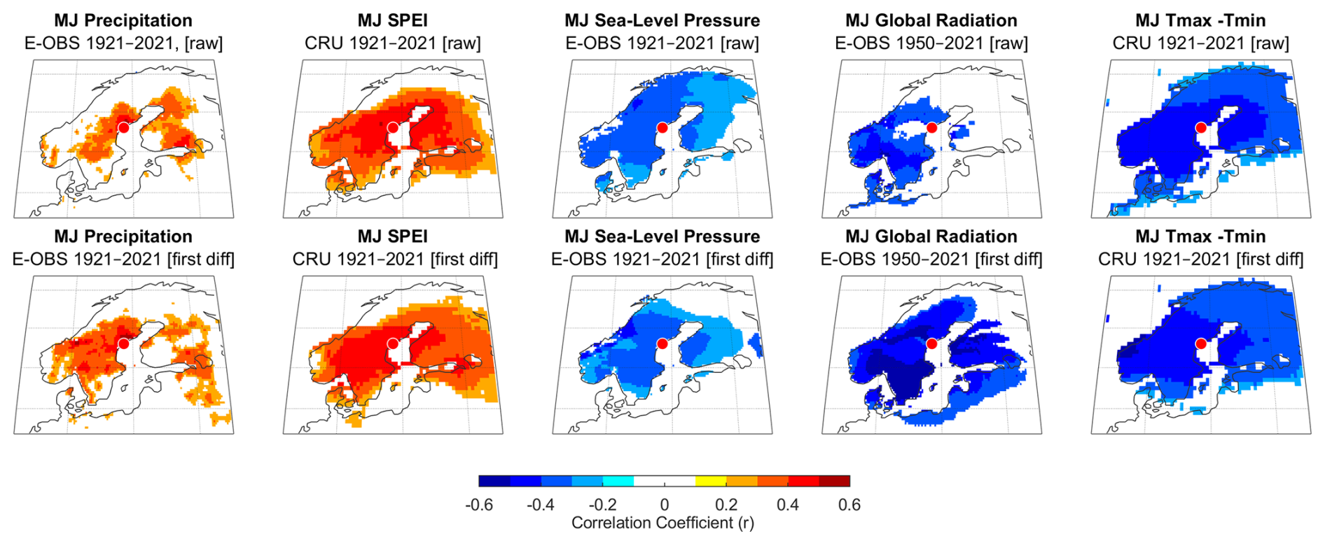 Figure 11 shows the spatial correlation fields between the chronology and various climatic metrics – including precipitation, SPEI, cloud cover, solar radiation, and diurnal temperature range – over the May–June period. The upper panel displays results using the mRCS chronology, while the lower panel shows results based on the first-differenced chronology. Large fields with significant correlations are primarily restricted to May and July, with July consistently showing the strongest individual-month signal (see Appendix E). Thus, the seasonal response window is short, but it explains, for some climatic parameters, conditions across most of Scandinavia.