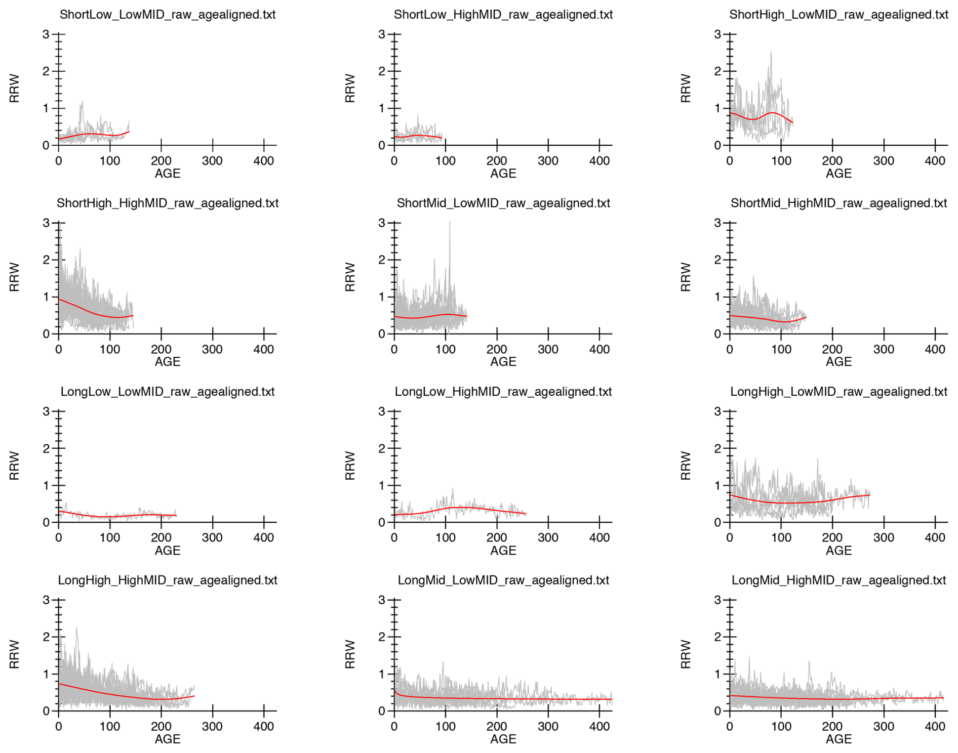 What follows is an abridged description of the multiple Regional Curve Standardization (mRCS) programs developed by Paul J. Krusic (https://www.geog.cam.ac.uk/research/projects/dendrosoftware/, last access: 11 February 2026) that represent an attempt to marry the need for removing non-climatic biological trends with conserving low-frequency climatic trends in annual tree-ring increments. Version 12 of the mRCS can distinguish up to 12 age–growth classes; two age classes, short and long; and six growth classes. A first order growth class distinction is based on the performance of each series' initial growth relative to that of the mean or median of the cohort's initial growth. For example, in version v12 the initial growth rate of the two age cohorts, Short and Long, is partitioned into three growth classes; ShortLow; series with an initial growth rate that is < (μ-1σ); ShortHigh; series' initial growth rate is > (μ-1σ); and ShortMid; all that remain. The next three growth conditions are based on the performance of the middle and final third of each series' growth rate. For example, the v12 age–growth class; ShortLow_LowMid contains all those series with a low initial growth rate, relative to the initial mean or median of all series in the short age cohort; and a low mid-life growth rate relative to the rate of growth in the series' final 1/3rd measurements (i.e., _LowMid). Conversely, the age–growth class LongHigh_HighMid describes long series that have overall high initial growth, and relatively high mid-life growth in relation to the growth rate in the last third of the series' length. In the end there are 12 age–growth classes.