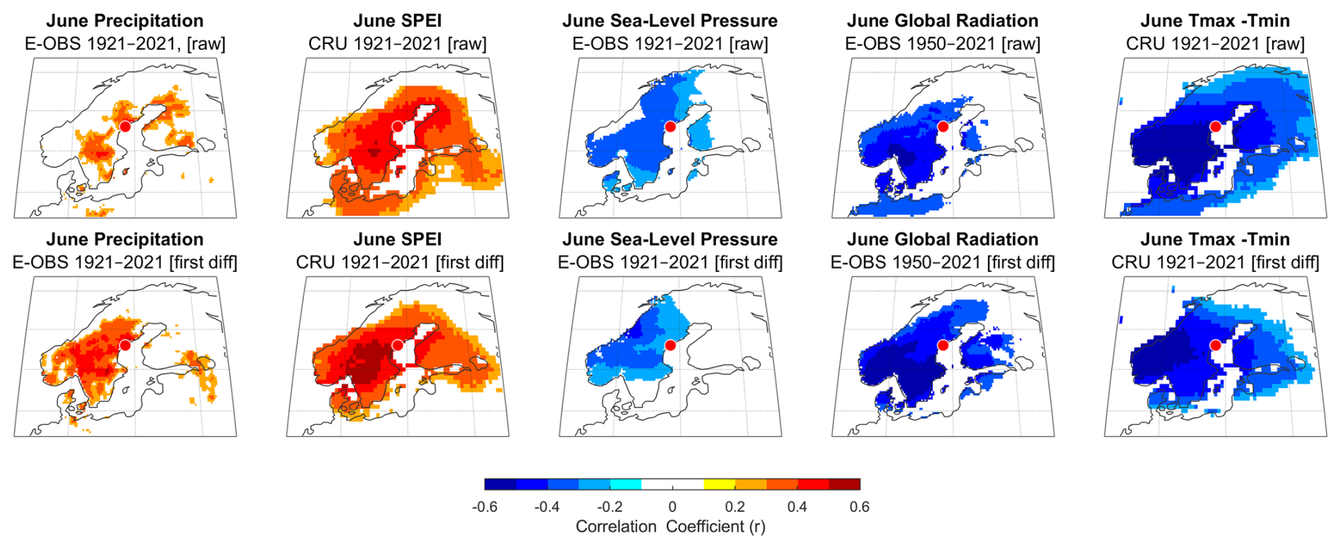 Precipitation shows the strongest correlation with chronology locally, while the other parameters – particularly those involving a temperature component, such as SPEI and diurnal temperature range (DTR) – tend to exhibit large significant field. Applying first differencing strengthens the precipitation correlation field, suggesting that high-frequency variability is better captured in the chronology than long-term trends. Interestingly, for all parameters except precipitation, the areas of strongest correlation tend to appear south or southwest of the site (which is indicated by a red dot). For individual months, June consistently exhibits the strongest signal, and for DTR and global radiation the spatial correlation field for June alone is comparable in extent to that for May–June (see Appendix E).