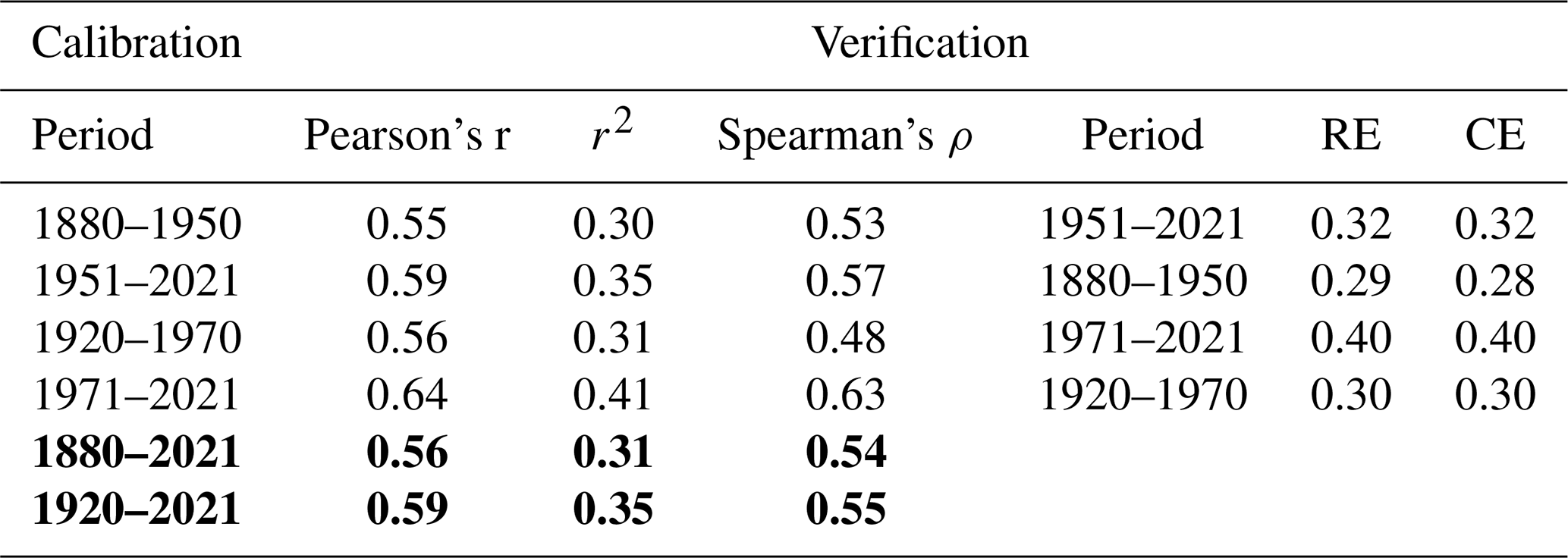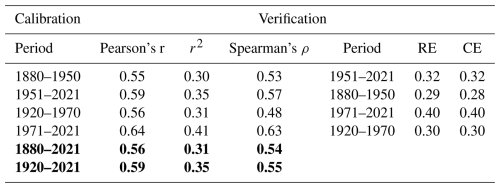 Table B1Split-sample calibration–validation results for the relationship between May–June Härnöand precipitation totals and the mRCS ring-width chronology, evaluated over the periods 1880–2021 and 1920–2021.