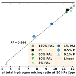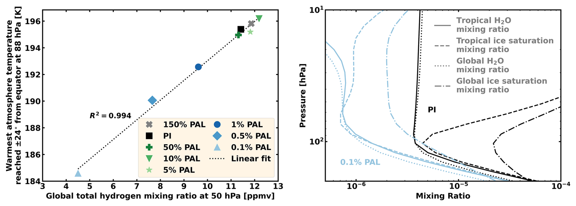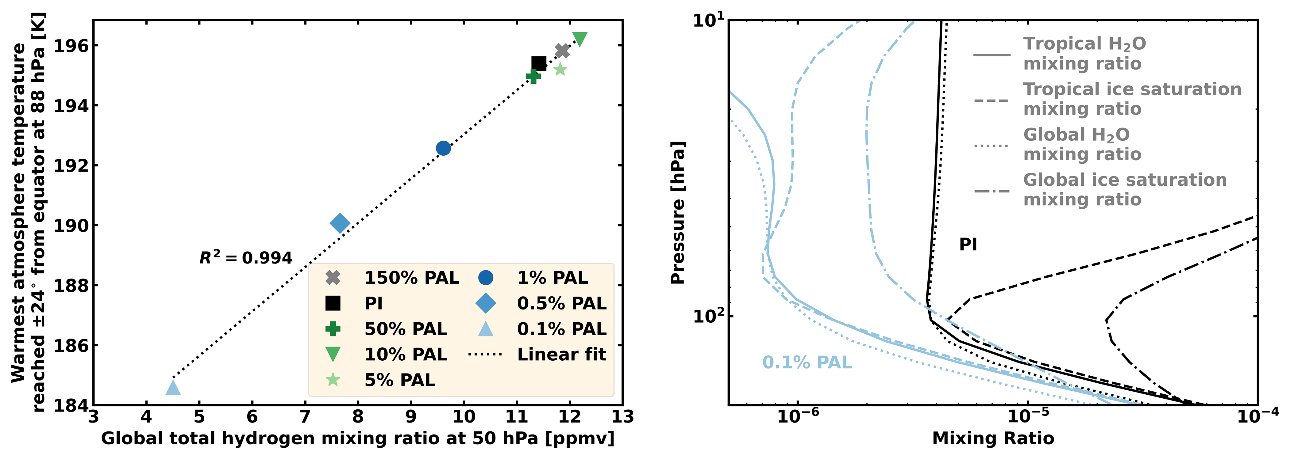 Figure 6Left: The globally averaged total hydrogen mixing ratio (fT(H)) at 50 hPa is plotted against the warmest temperature reached within ±24° (tropical latitudes) from the equator at 88 hPa for each simulation. Linear regression gives a coefficient of determination (R2) of 0.994, which is showed by the dotted black line. The different O2 mixing ratios are shown by various markers: 150 % PAL (grey cross), PI (black square), 50 % PAL (dark green plus), 10 % PAL (green downward triangle), 5 % PAL (light green star), 1 % PAL (dark blue circle), 0.5 % PAL (blue diamond), and 0.1 % PAL (light blue upward triangle). Right: The H2O mixing ratio is plotted against pressure for the PI (black) and 0.1 % PAL (light blue) simulations, in terms of its tropical (unbroken line) and global (dotted line) average. Also shown is the ice saturation mixing ratio which depends on temperature and pressure and is shown for the tropical (dashed) and global (dash-dotted) average. The tropical average is for latitudes ±24° from the equator.