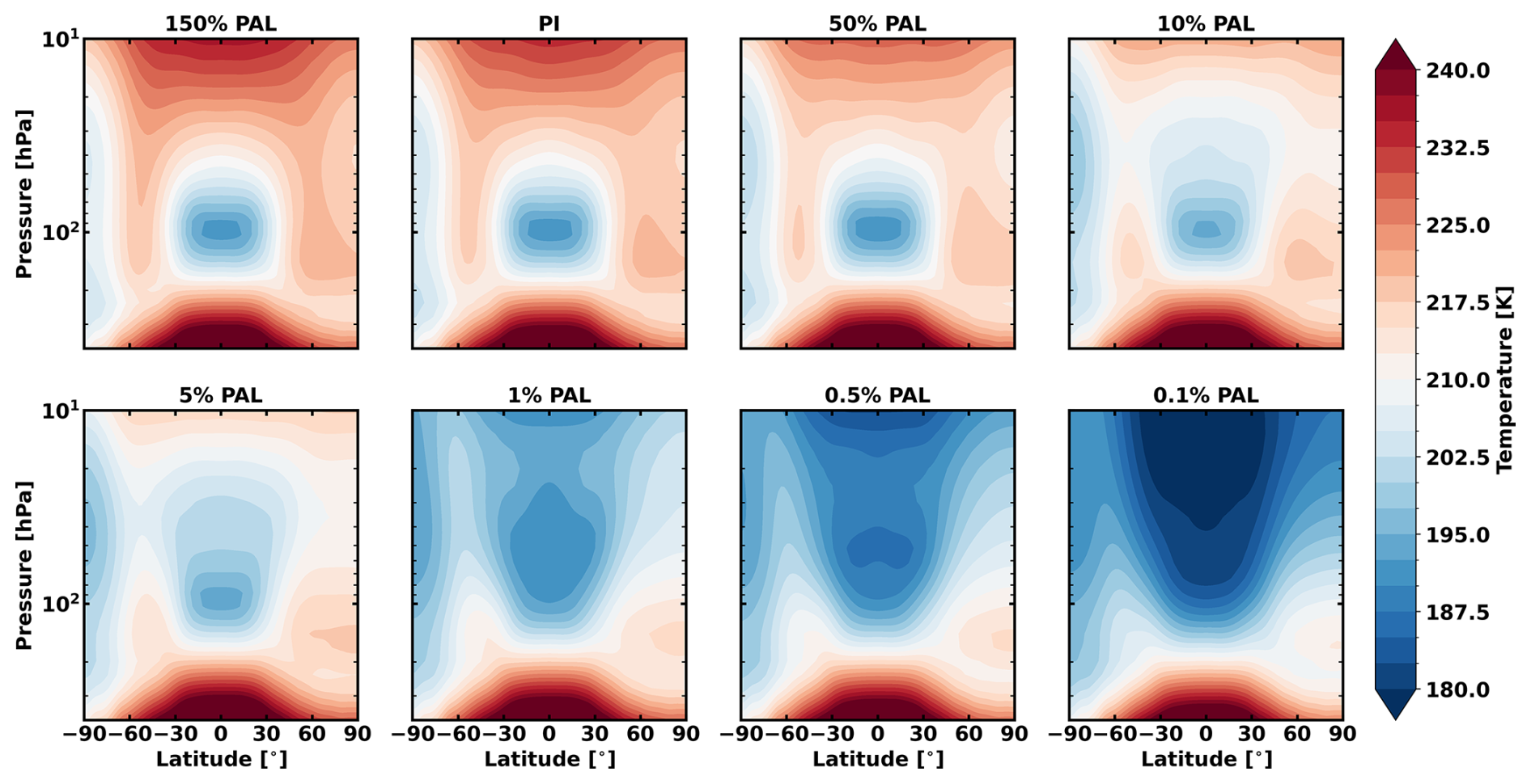 Figure 1The zonal mean of atmospheric temperature (in K) is shown for simulations with O2 mixing ratios between 150 % PAL and 0.1 % PAL, where O2 decreases in abundance from the top left panel to the bottom right panel. The colour bar shows hotter temperatures in red and colder temperatures in blue. The TTL region is ±23.4° from the equator and between 70–150 hPa in pressure.