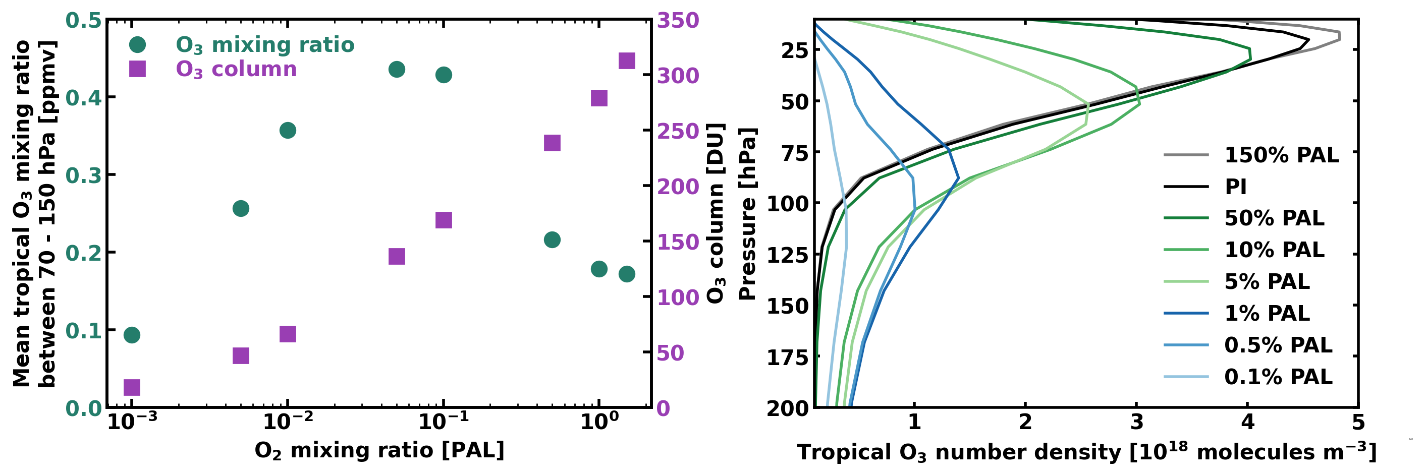 Figure 2Left: The mean tropical (defined at latitudes ±24° from the equator) O3 mixing ratio between 70–150 hPa is plotted on the left vertical axis in teal circles against the atmospheric mixing ratio of O2 at the surface in terms in terms of the present atmospheric level (PAL), which is 21 % by volume. The total global ozone (O3) column density in Dobson Units (DU, where 1 DU molec. m−2) is also plotted in purple squares on the right vertical axis against the atmospheric mixing ratio of O2. Right: The O3 number density is shown for all eight simulations between 10–200 hPa on a linear scale (note the number density does not go to zero at pressures greater than 200 hPa, see Cooke et al., 2022).