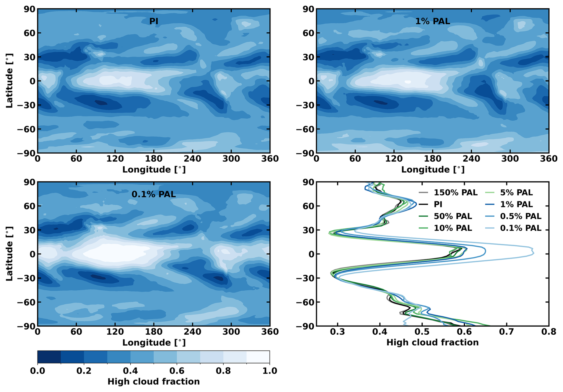 Figure 3The top left, top right, and bottom left panels show the high cloud fraction as a function of longitude and latitude for the PI, 1 % PAL, and 0.1 % PAL scenarios, respectively. Bottom right: The high cloud fraction (high clouds are defined as clouds at pressures <400 hPa) is averaged over longitude and shown as a function of latitude for all the WACCM6 simulations.