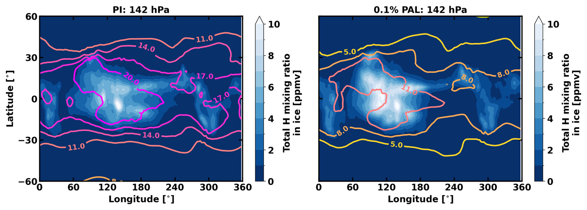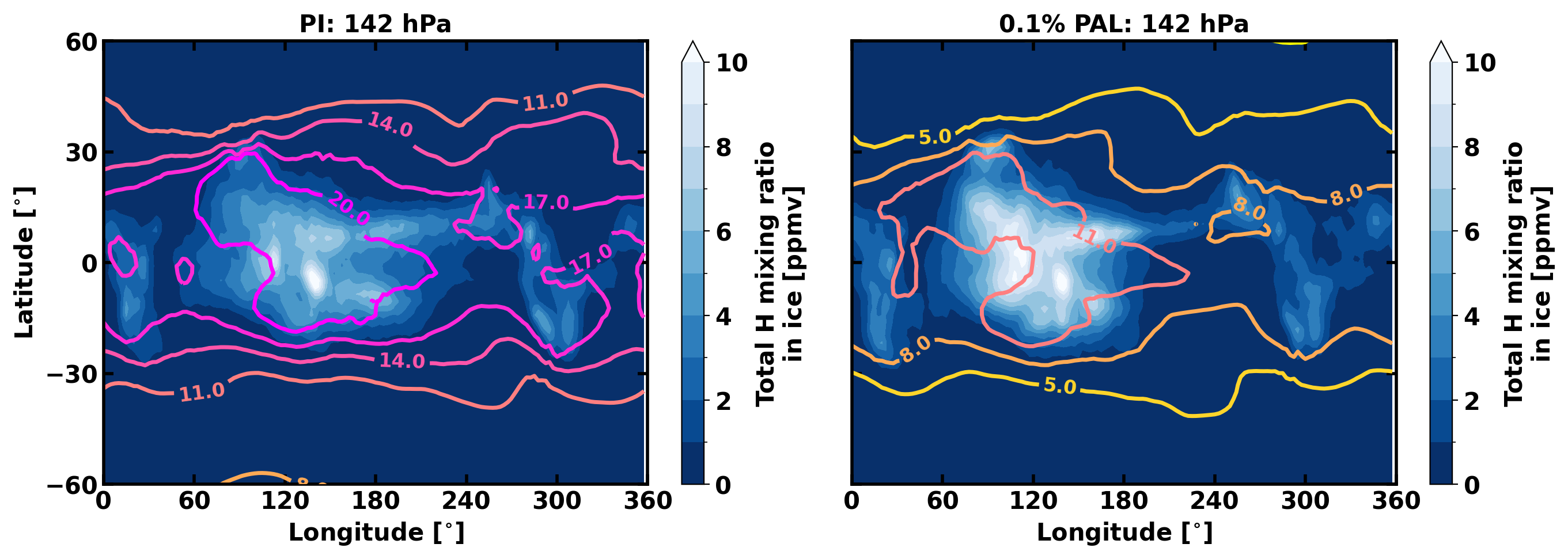 Figure 4The atmospheric ice content (blue-white shading) and the amount of atmospheric H2O (magenta-orange-yellow contours) is shown on the latitude-longitude grid of the Earth. Both are given in terms of ppmv. The PI simulation (left) and the 0.1 % PAL simulation are shown (right). Both scenarios are shown for a pressure level of 142 hPa, which corresponds to an altitude of ≈14 km near the base of the TTL.