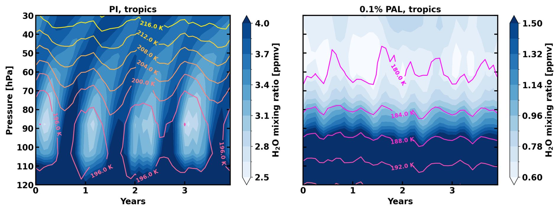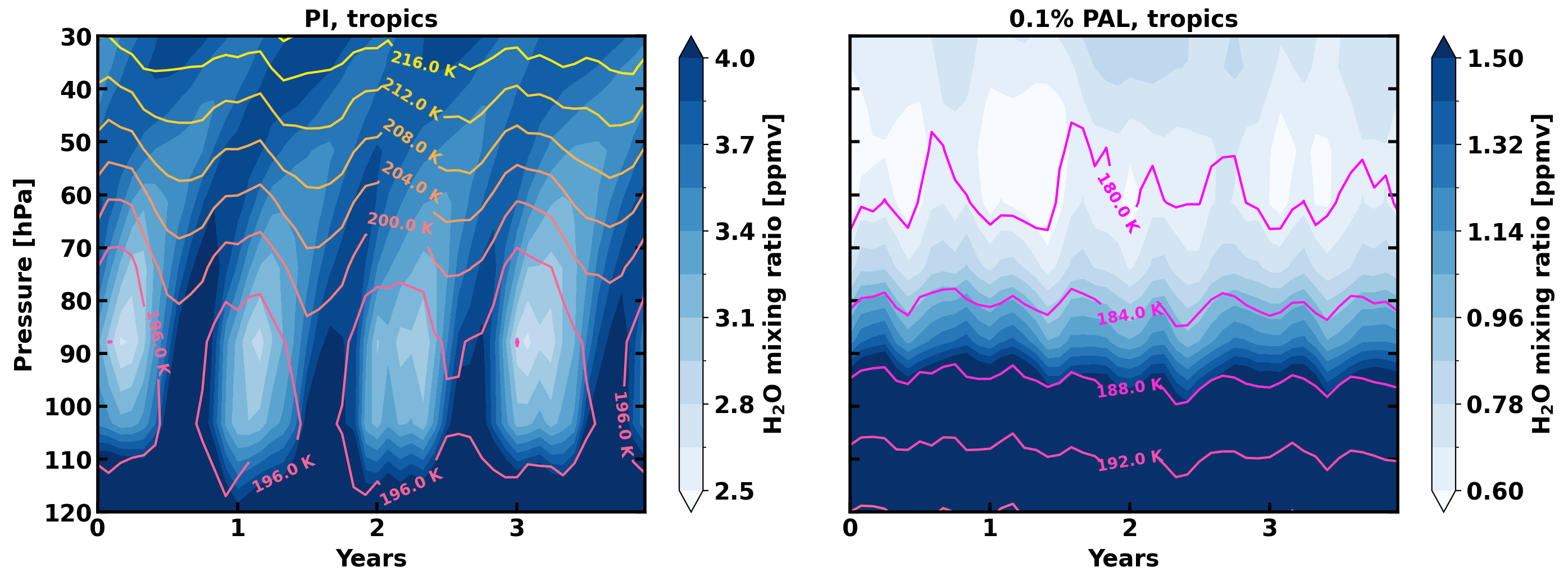 Figure 5The water vapour mixing ratio in ppmv is shown for the PI scenario (left) and the 0.1 % PAL scenario (right) between pressures of 120–30 hPa. Each panel shows four years in a row of each simulation, displaying the zonally averaged and latitudinally weighted H2O mixing ratio in the tropics between ±24°. Whites show the lowest mixing ratios and darker blues show progressively larger mixing ratios. Note the different scales on each colour bar. The contours show the atmospheric temperature in kelvin, with yellow indicating higher temperatures and magenta indicating lower temperatures.