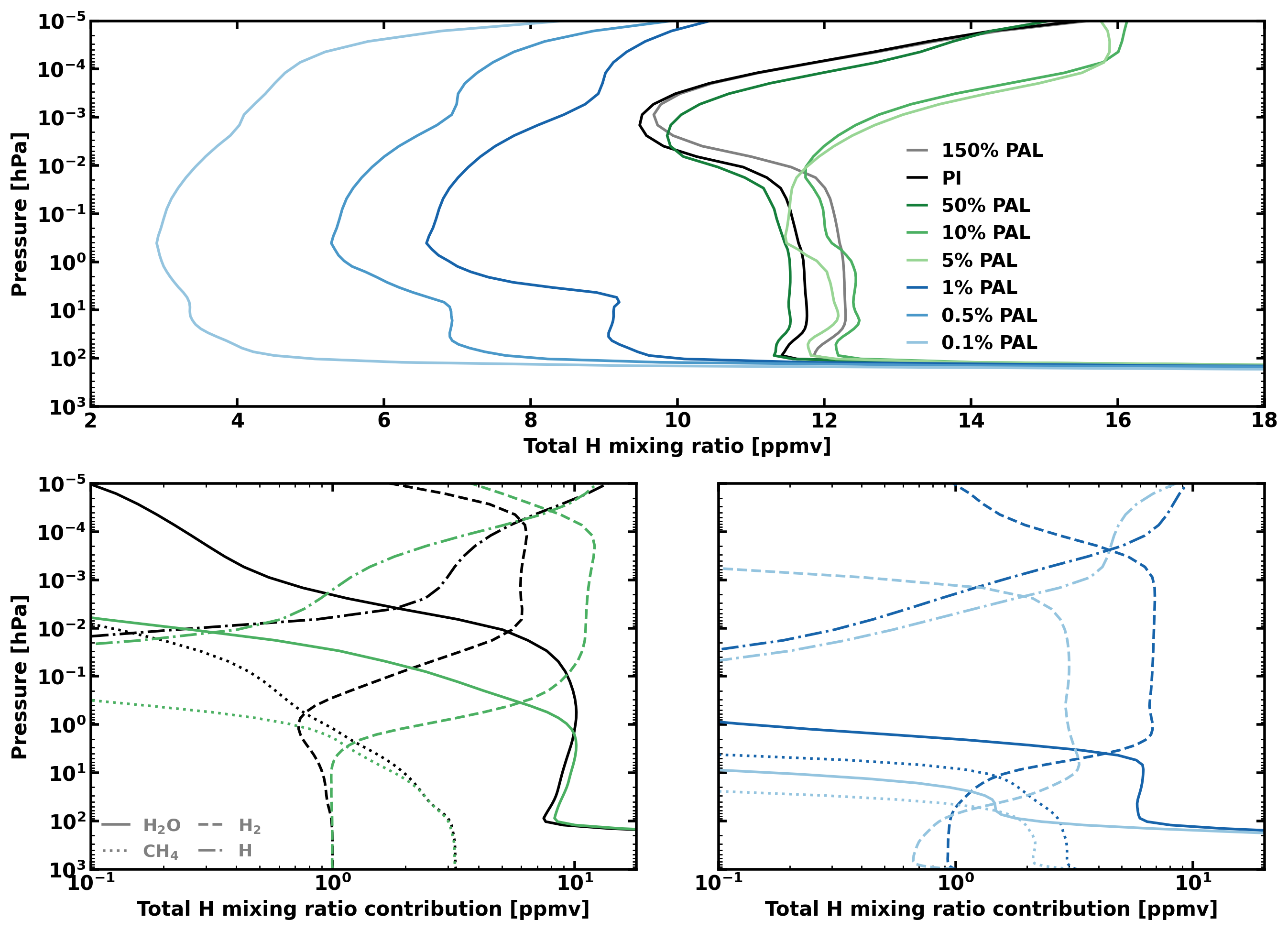 Figure 7 also shows the total hydrogen contribution from the four species that carry the majority of hydrogen atoms (H, H2, H2O, and CH4). These panels show that for the PI simulation (black lines), H2O is the primary carrier of hydrogen atoms in the lower atmosphere. Above the cold trap in the TTL, the H2O mixing ratio increases until it reaches a maximum mesospheric value (≈5 ppmv) due to CH4 reacting with OH. At a pressure of approximately 0.01 hPa, H2 then becomes dominant. Photolysis of H2O, CH4, and H2, as well as diffusive separation, cause atomic H to become the primary carrier at pressures less than 10−4 hPa.
