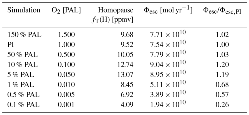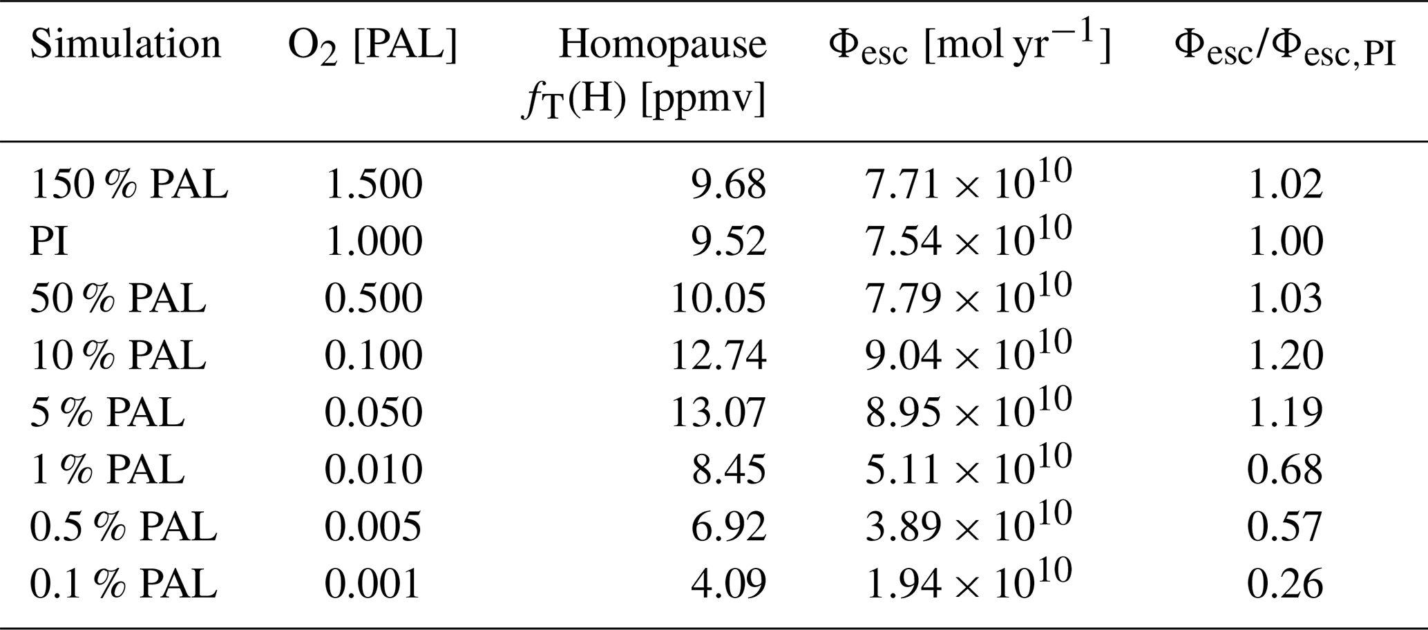 Table 1This table shows the eight simulations where the mixing ratio of O2, given in terms of present atmospheric level (PAL), was varied. The total hydrogen mixing ratio, fT(H), in ppmv at the homopause, which is taken to be at a pressure of 10−3 hPa. The diffusion-limited hydrogen escape rate is given by Φesc in mol yr−1 and compared to the predicted escape rate in the PI simulation (Φesc,PI).