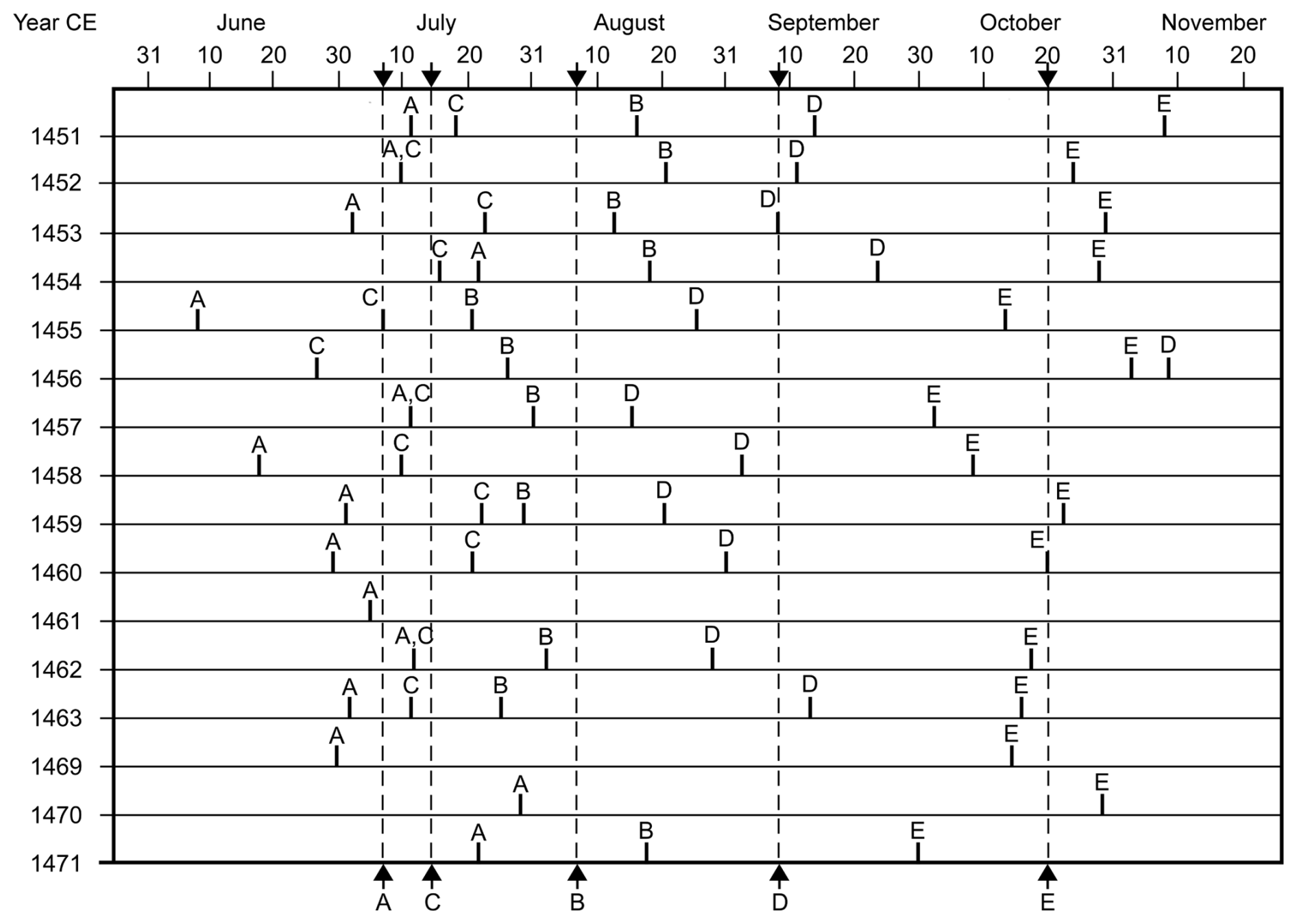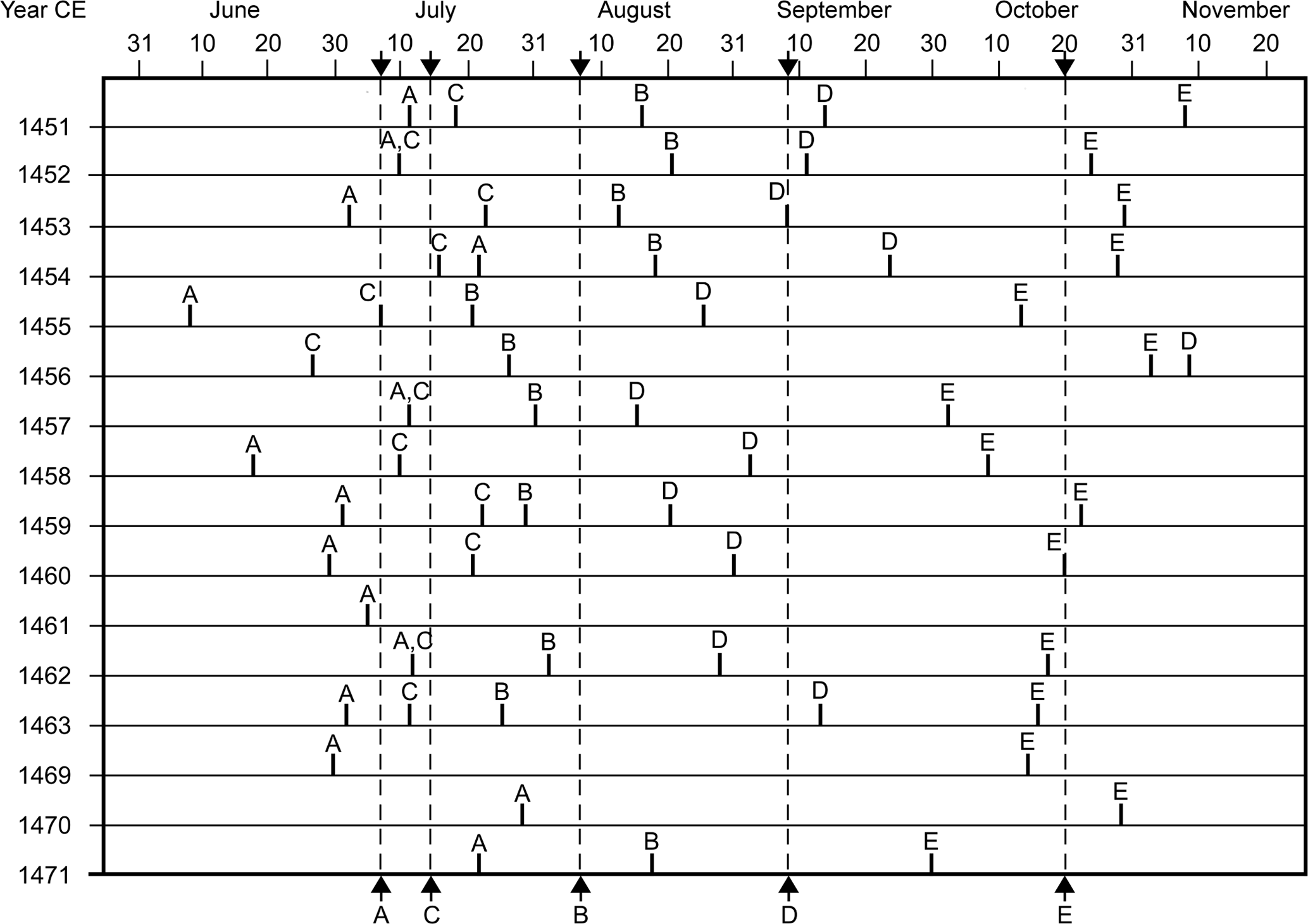 Figure 1Changes in the beginnings and endings of haymaking, grain harvest and grape harvest (always in the week before the given date) in the Louny region for 1451–1463 and 1469–1471 CE according to Liber rationum: A – beginning of haymaking, B – end of haymaking, C – beginning of grain harvest, D – end of grain harvest, E – beginning of grape harvest. Vertical broken lines indicate mean dates in 1451–1471 (Table 1) (corrected according to Brázdil and Kotyza, 2000).