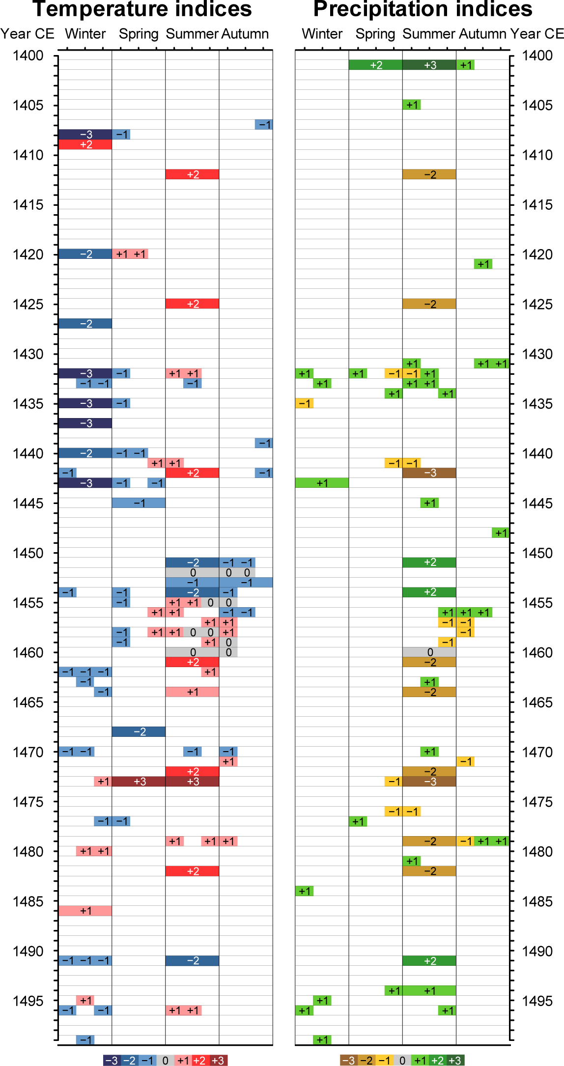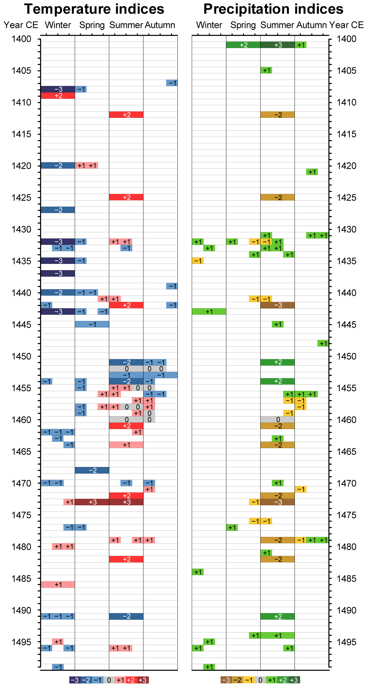 Weather data from the described sources (see Supplement) were used for quantification of monthly and seasonal temperature and precipitation indices. Monthly indices were interpreted on a 3-degree scale and seasonal indices on a 7-degree scale (see Sect. 4). Since documentary evidence for the Czech Lands during the 15th century is relatively scarce, the months and seasons interpreted represent only a small part of that time. However, at least one month and/or season was interpreted in 45 years for temperature indices and in 40 years for precipitation indices (Fig. 2). Weather patterns for winters and summers were more frequently accessible to analysis than those for springs and autumns. This is predominantly a response to the practicalities of a largely rural society that needed to use its roads for essential business and diplomacy. Thus, winter attracted attention and comment if the weather was extreme – severe frosts or a huge amount of snow causing fatalities, blocking transport and putting watermills out of commission, or if it was very mild and muddy, with no snow or very little. In summer, direct effects on agricultural activities were paramount, with possible harvest failure, together with consequences such as increasing prices, the occurrence of famine, etc. Spring tended to manifest as either prolongation of a severe winter to March or April on the one hand, or the effects of May weather on agricultural work, on the other. Autumn reports tended to mainly refer to the weather's influencing the start of the grape harvest or an advanced onset of winter frosts.