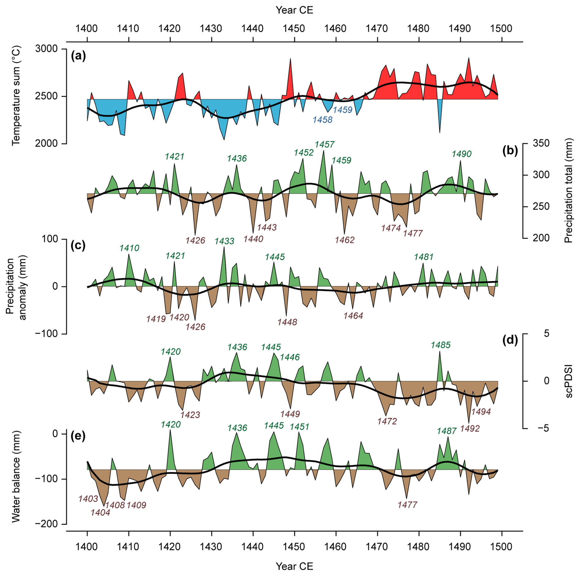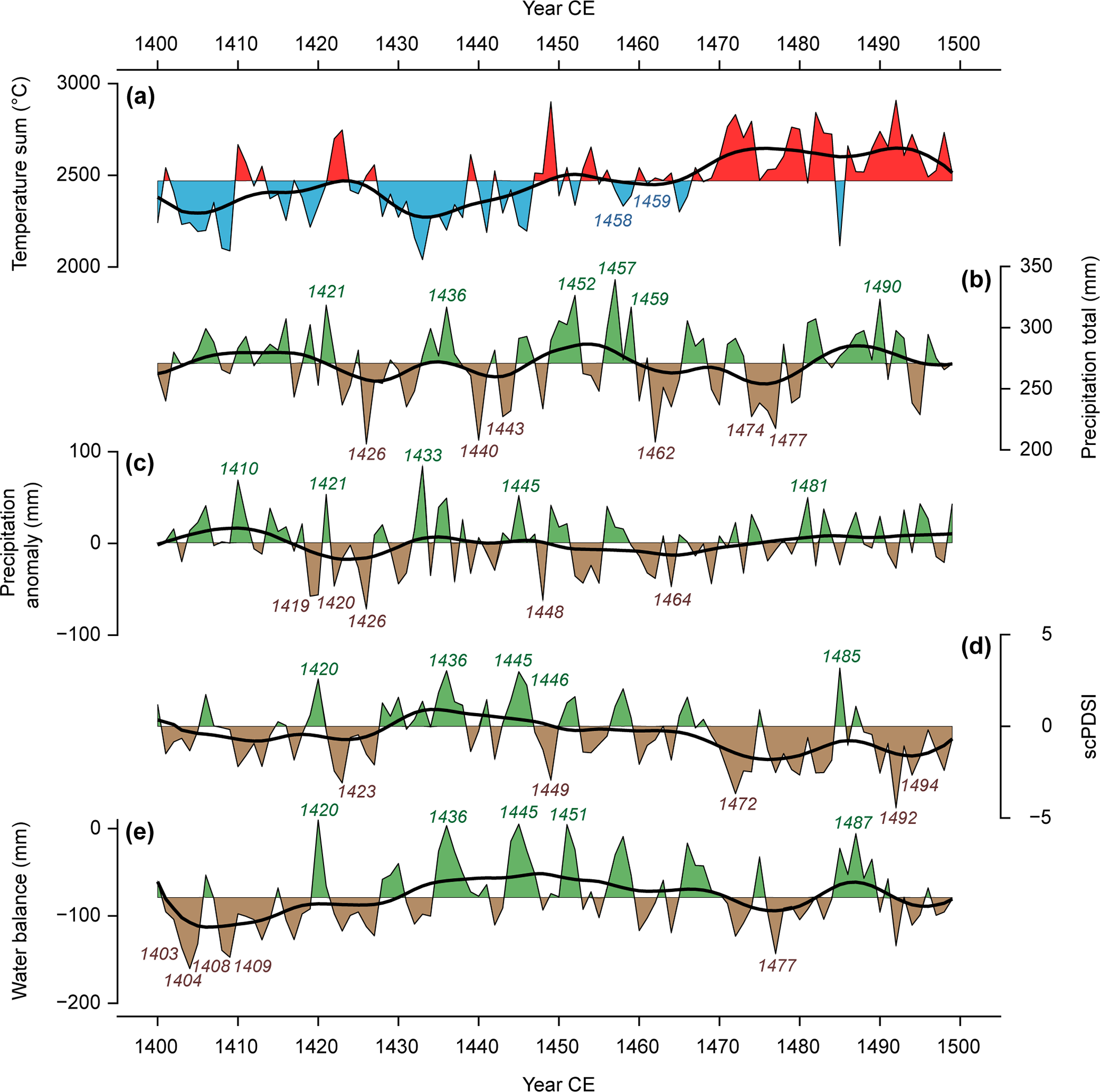 Figure 4Estimated variability of climate variables over the territory of the Czech Lands in the 1400–1499 CE period: (a) annual temperature sum from oak (Quercus spp.) δ18O stable isotopes (Torbenson et al., 2023); (b) March–July precipitation totals reconstructed from fir (Abies alba) TRWs for South Moravia (Brázdil et al., 2002); (c) May–July precipitation totals reconstructed from oak TRWs for Bohemia (Dobrovolný et al., 2018); (d) June–August self-calibrating Palmer Drought Severity Index (scPDSI) reconstructed from oak δ18O and δ13C (Büntgen et al., 2021); and (e) June–August water balance from oak δ13C (Torbenson et al., 2023). Anomalies of mean annual values with respect to the 15th-century mean (with the exception of scPDSI, which is plotted in absolute values) are expressed in green and brown colours (in red and blue for temperature sums). Bold black lines indicate series smoothed by a low-pass Gaussian filter for 15 years. For each of the hydroclimate series (b–e), the five wettest and five driest years are indicated.