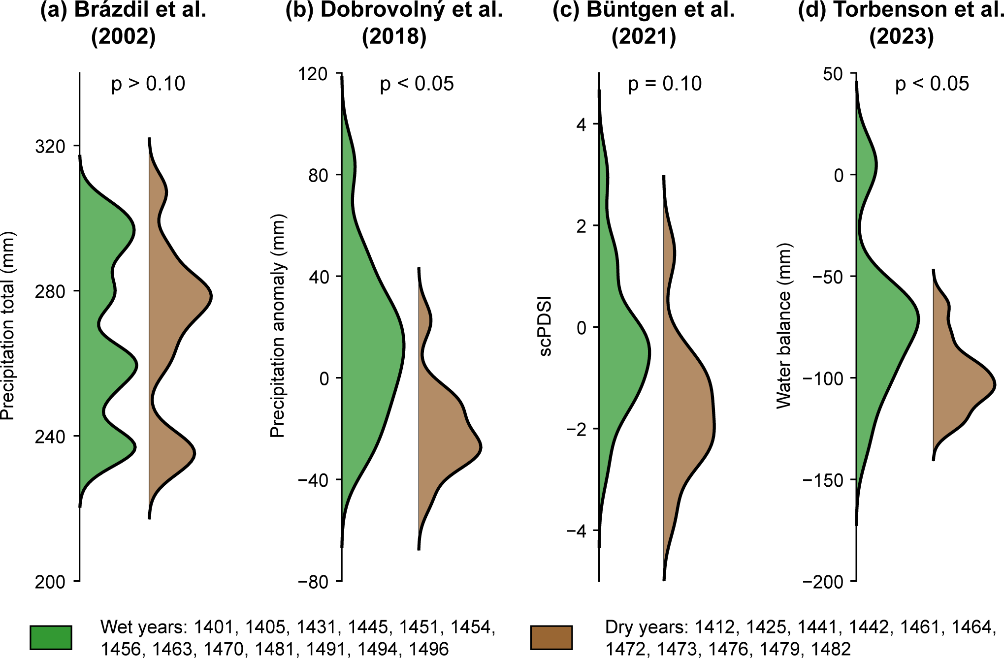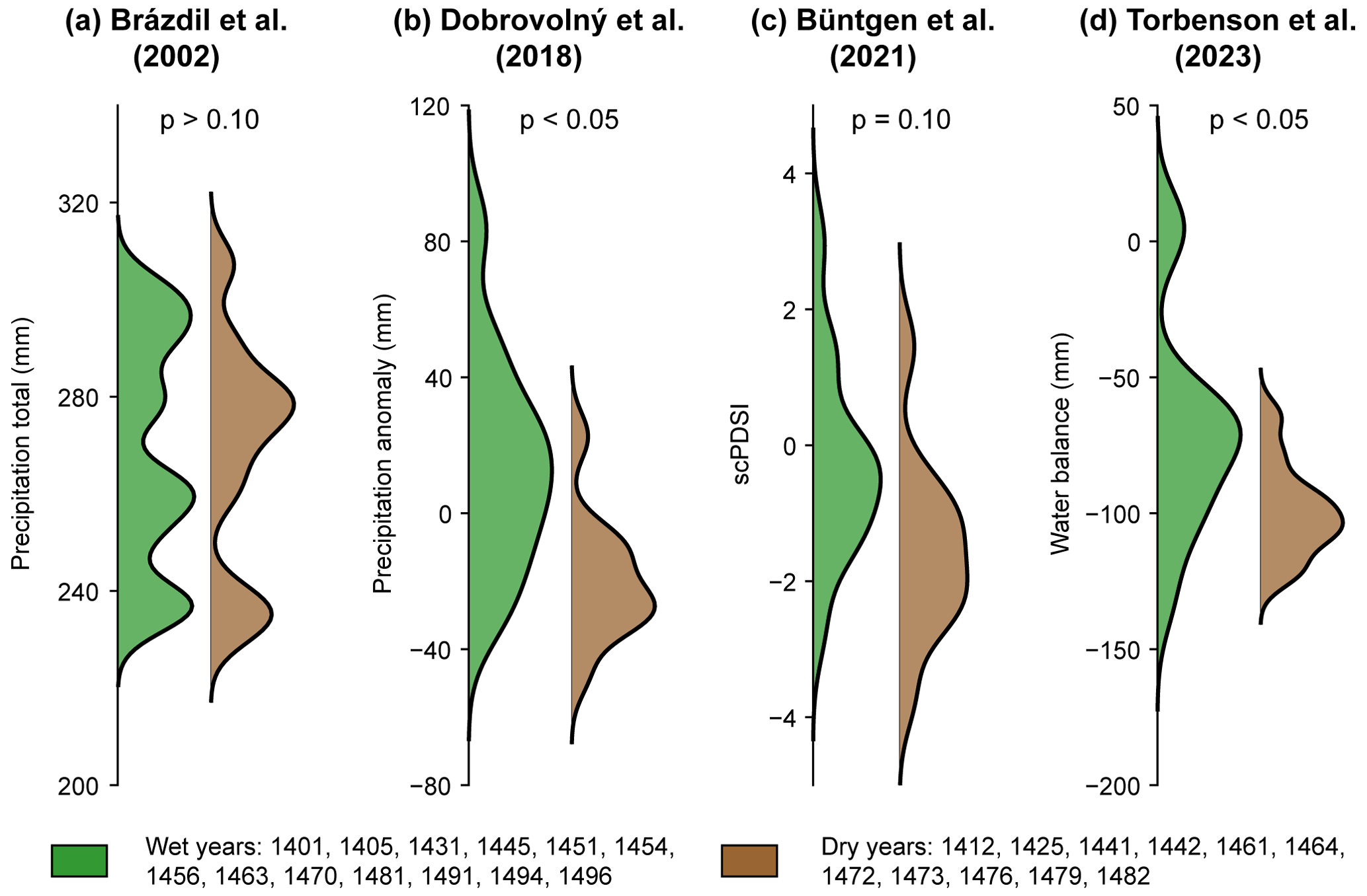Figure 5Kernel density distributions (based on bandwidths =1/10th of the range of reconstructed values) of proxy-reconstructed hydroclimate for years of summer precipitation anomalies in the documentary data (green = wet; brown = dry) of the 15th century: (a) Brázdil et al. (2002); (b) Dobrovolný et al. (2018); (c) Büntgen et al. (2021); (d) Torbenson et al. (2023). Significant values (p< 0.05) indicate that the values in Dobrovolný et al. (2018) and Torbenson et al. (2023) are from different distributions.