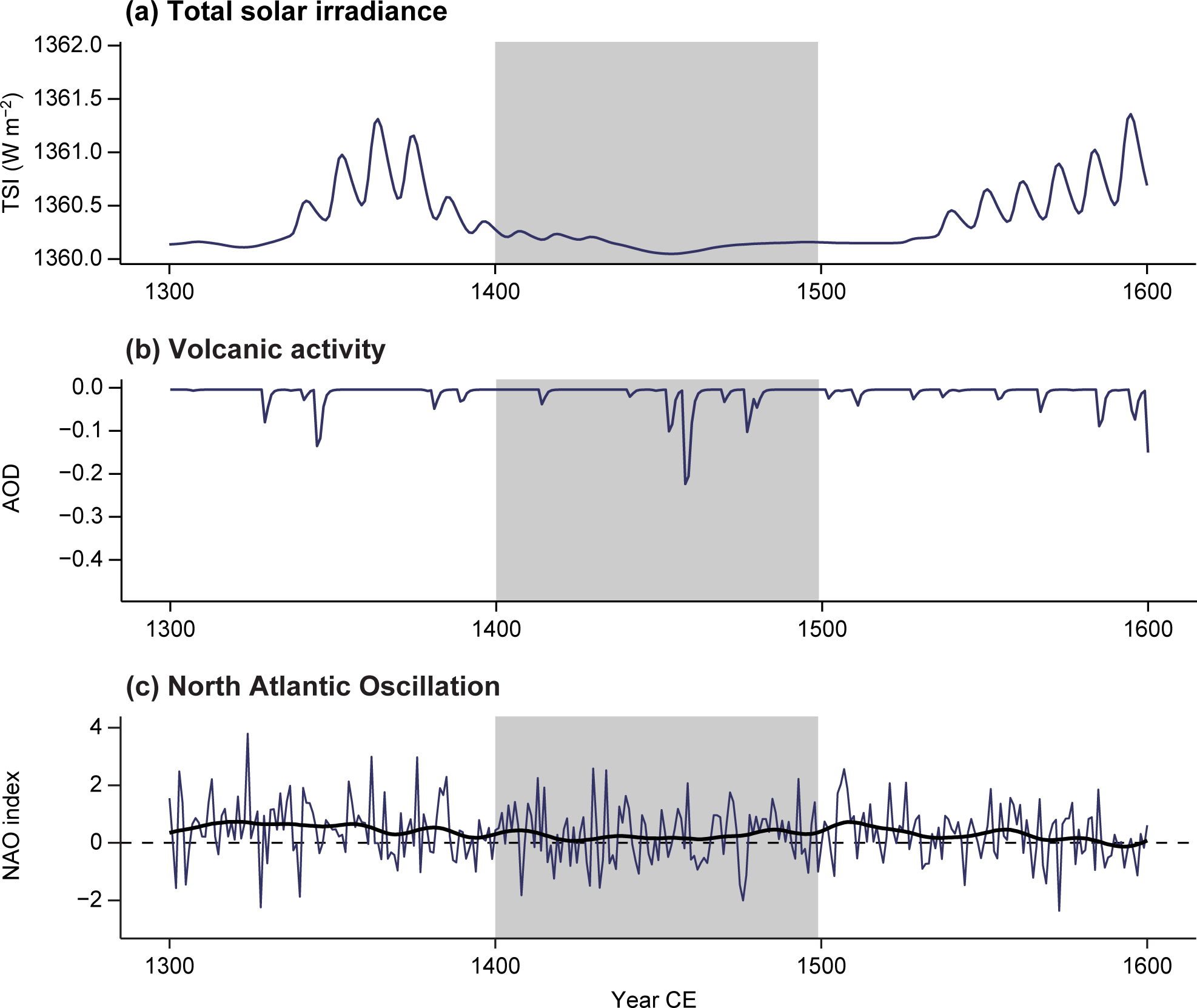 Figure 6Fluctuations in (a) total solar irradiance (TSI; Lean, 2018), (b) volcanic activity (stratospheric aerosol optical depth AOD; Toohey and Sigl, 2017), and (c) North Atlantic Oscillation (NAO index; Cook et al., 2019) in the 1300–1600 CE period. Note inverted AOD values. NAO index is smoothed by a 20-year Gaussian filter.