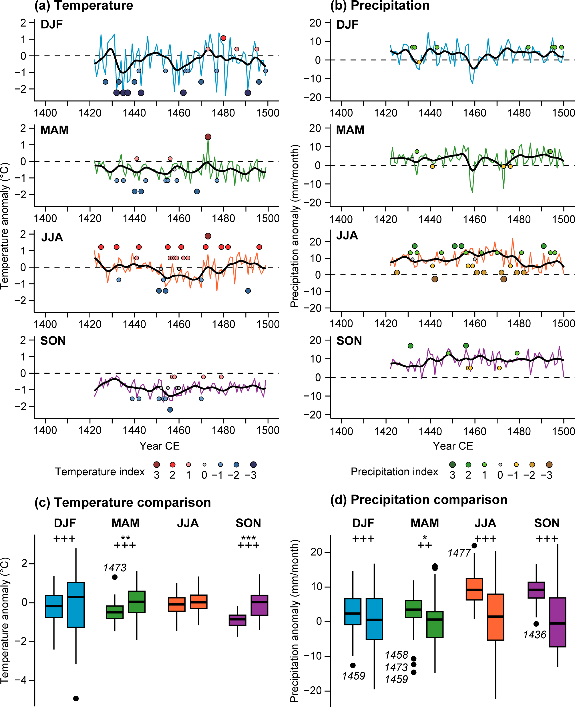 Figure 7Fluctuations in mean seasonal temperatures (a) and precipitation totals (b) in Central Europe (45–55° N, 5–25° E) in the 1422–1499 CE period according to ModE-RA reanalysis (Valler et al., 2024) complemented with the Czech seasonal temperature and precipitation indices. Values are expressed as anomalies w.r.t. 1961–1990 (dashed horizontal line) and smoothed by a 10-year Gaussian filter. Comparison of mean seasonal temperatures (c) and precipitation totals (d) in the 1422–1499 CE period (left boxplot) with the 1961–1990 reference (right boxplot), and completed with t-test comparing means (: p< 0.001; : p< 0.01; : p< 0.05) and Levene's test comparing variances (+++: p< 0.001; ++: p< 0.01; +: p< 0.05). Black points indicate temperature and precipitation outliers.