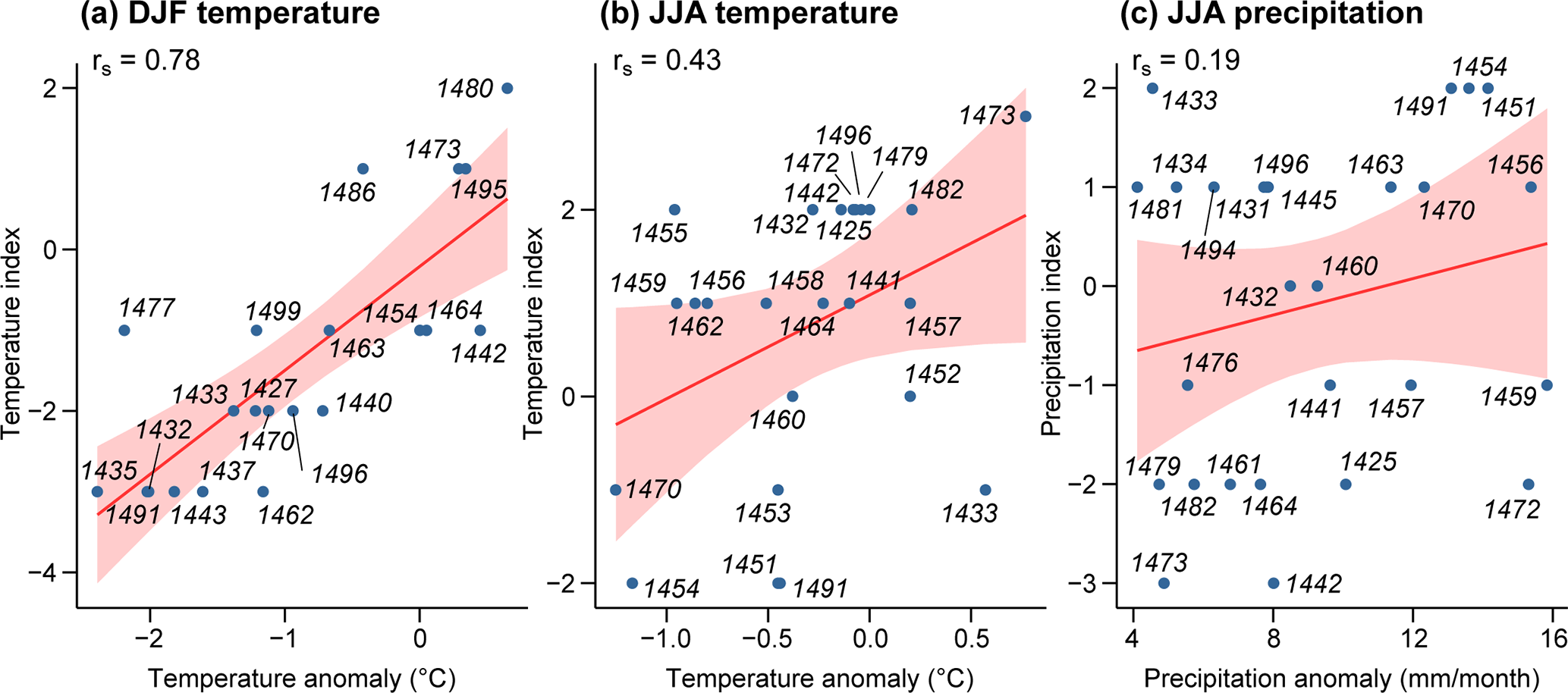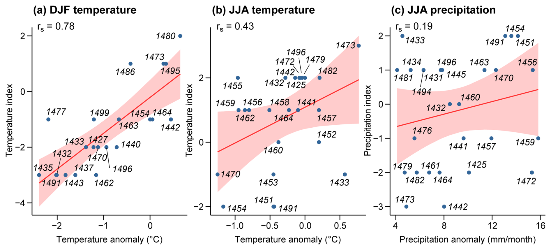 Finally, Spearman's rank correlation and regression analysis were used to quantify the common variance between the Czech temperature and precipitation indices and the reanalysis in 1422–1499 CE. These analyses were limited only to the years with available indices interpreted from documentary data.