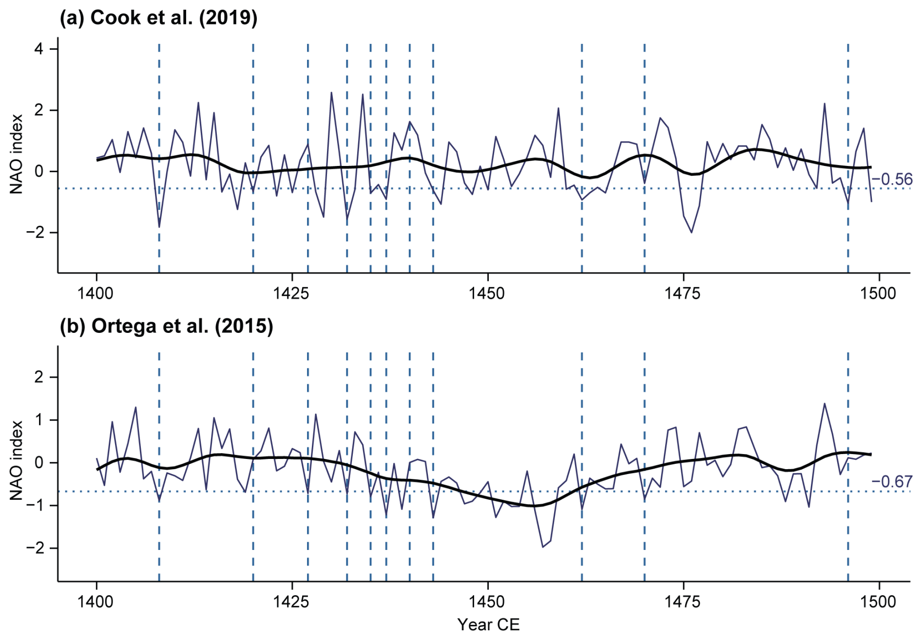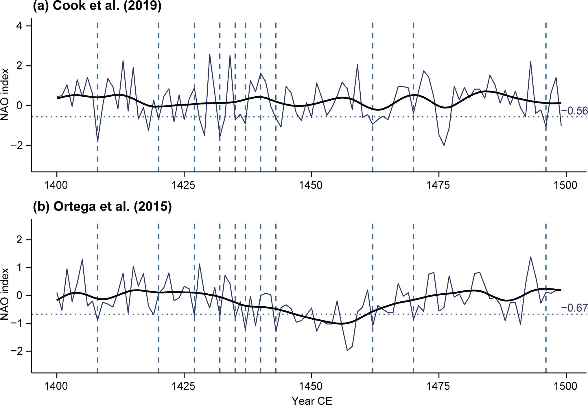 tree-ring reconstruction of the winter (December–March) reconstruction of the North Atlantic Oscillation (NAO) by Cook et al. (2019).
