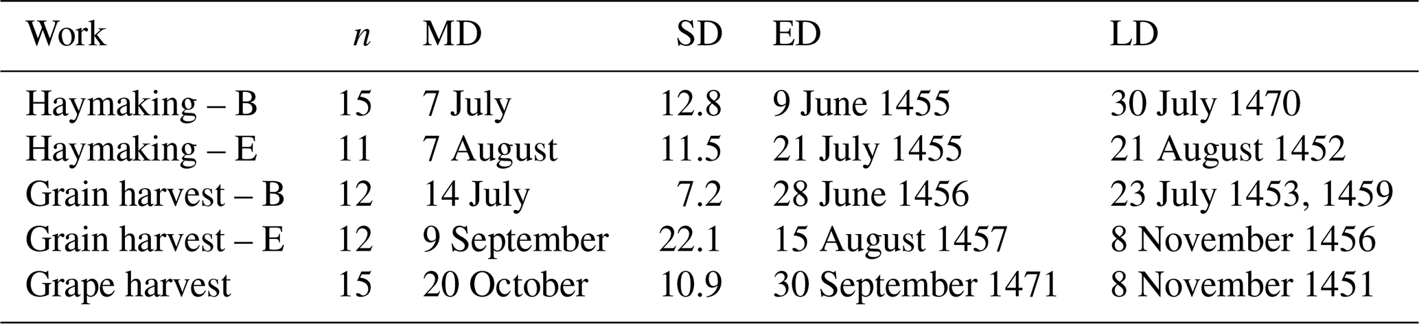 Table 1Dates upon which wages were paid in the Louny region for field work in the preceding week during 1451–1463 and 1469–1471 CE according to Liber rationum. Key: B – beginning, E – end, n – number of years with related records, MD – mean date, SD – standard deviation (days), ED – earliest day, LD – latest day (corrected according to Brázdil and Kotyza, 2000).