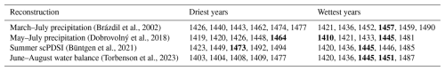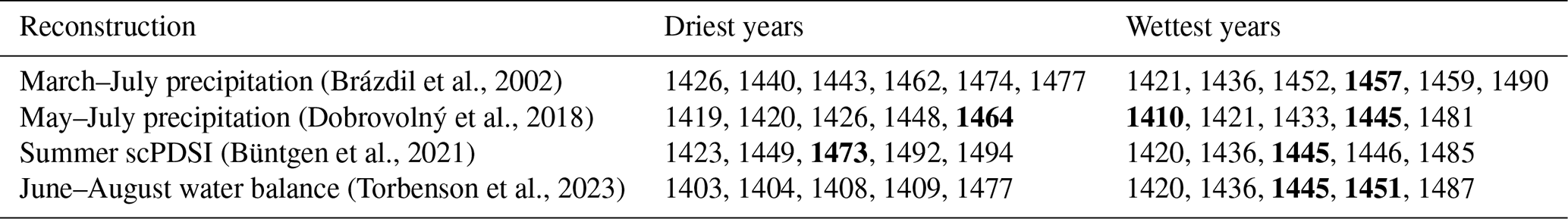 Table 2Overview of the five driest/wettest years in four hydroclimatic recontructions for the Czech Lands in the 1400–1499 period. Years of part or full agreement with Czech precipitation indices (Fig. 2) appear in bold type. Six years are provided for the Brázdil et al. (2002) reconstruction due to equal ranks of reconstructed values.