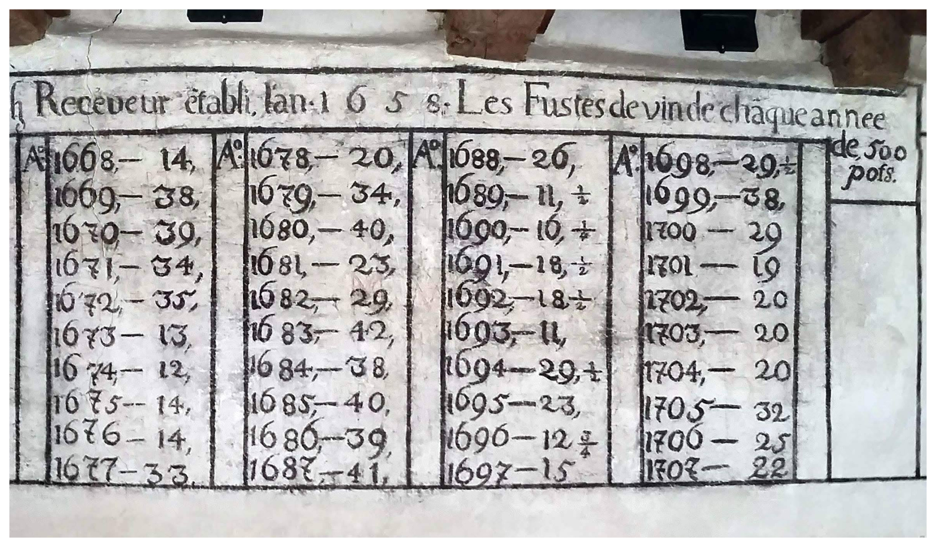 Figure 2A display of the annual wine must crop collected for a private owner between 1658 and 1757. This visual monument was painted at a wall in the basement of today's Viticultural Museum in Ligerz (Canton Bern) by order of the receveur (supervisor). Data in barrels of 845 L. Photo: Heidi Lüdi Pfister, Copyright Viticultural Museum Ligerz (Canton Bern).