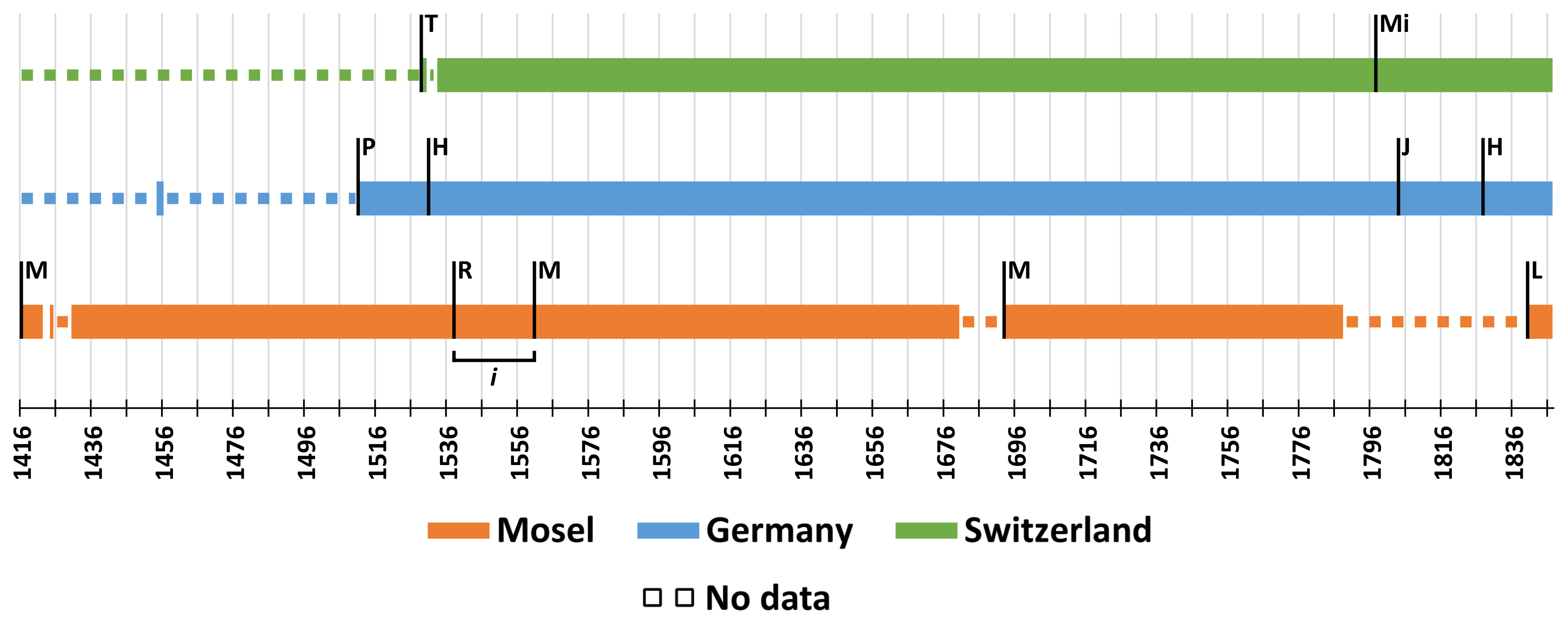 The supra-regional series Mosel comprises the two regional series Metz (Table 1, source 1), supplemented by Remich and Luxembourg (Table 1, source 3). The supra-regional series Germany comprises the regional series Prüfening (Table 1, source 4), Heilbronn (Table 1, source 5), Germany (Table 1, source 6) and Johannisberg (Table 1, source 7). The supra-regional series Swiss Plateau comprises the three regional series Swiss Plateau 1 to 3 (Table 1, source 8.10).