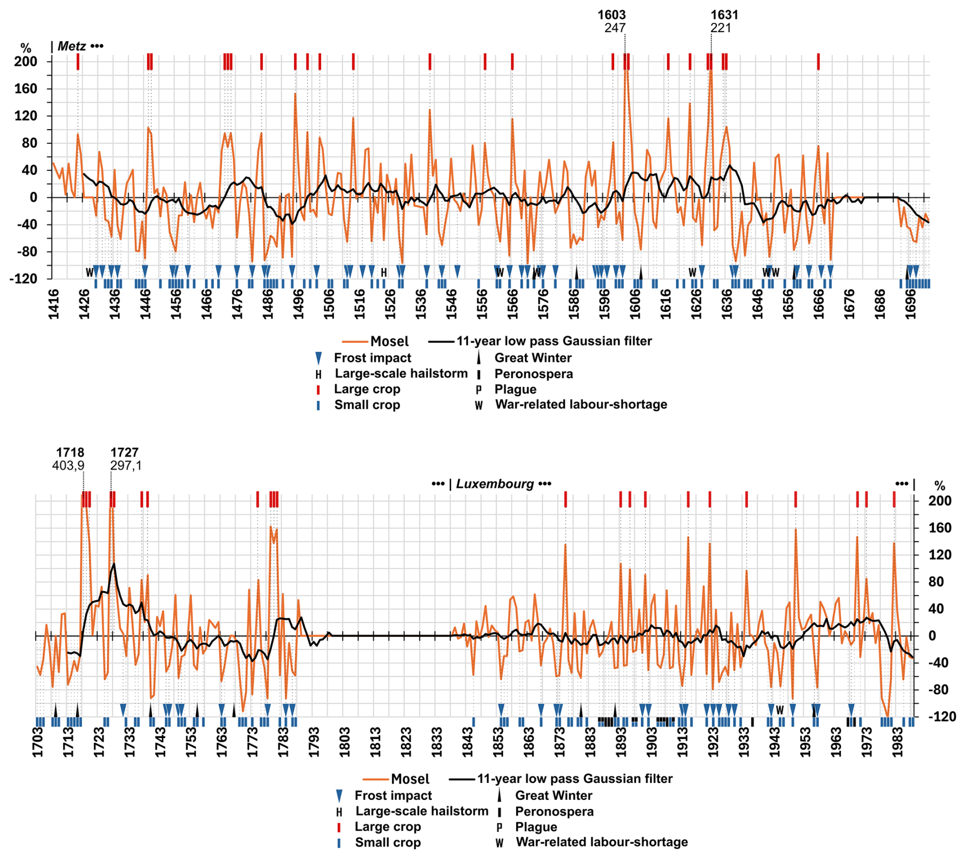Figure 4 shows the supra regional Mosel series as a percentage of the mean. The first segment shows the wine tax yield within the geographical boundaries of the City Republic of Metz (see Table 1, source 1). After a period of predominantly good harvests from 1416 to 1425, yields declined until 1446 due to recurrent severe winter and spring frosts (Camenisch et al., 2016). After two substantial harvests in 1447 and 1448, yields remained below average until 1470, largely due to repeated cold summers caused by volcanic eruptions in the 1450s (Sigl et al., 2015). During the warm years (1472 to 1474), three large yields were recorded; meanwhile, yields between 1481 and 1495 fluctuated widely due to erratic weather patterns. A decline until around 1530 was followed by a long period of stagnation that turned into a decade of frequent crop failures in 1586. Yields fluctuated above average between 1603 and 1636. Then they fell sharply, possibly because of the plague and the Thirty Years' War (1618–1648). In 1646, Metz was occupied by French troops, which might have caused a further slump in yields. From 1672 to 1693, records on yields are missing altogether. Disregarding a large crop yield in 1706, yields were mainly below average until 1717. A sequence of warm summers shaped the period from 1718 to 1728, with the yield in 1718 achieving 400 % of the average. A shorter run of large harvests was registered from 1779 to 1781. Spring frosts were frequent in the 1430s and the periods from 1561 to 1576, 1586 to 1602 and 1651 to 1671. Remarkably, few frost events were recorded from 1531 to 1560, 1606 to 1625 and 1718 to 1739.