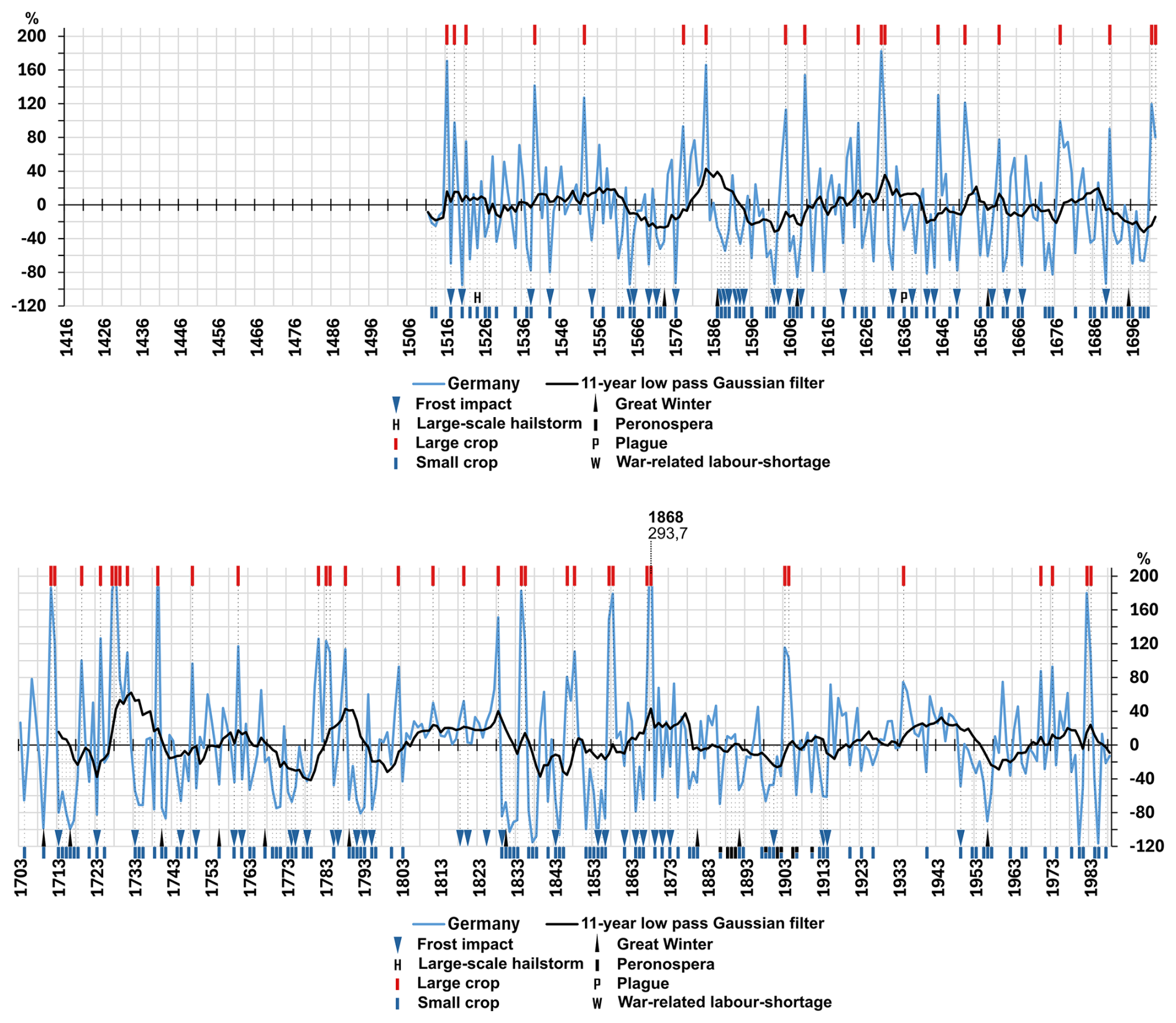 Figure 5 shows the supra regional Germany series as a percentage of the mean. The first part until 1518 refers to the rent paid to the Prüfening monastery (Table 1, source 4). From 1519 to 1803 and from 1826 to 1921, it applies to the Heilbronn regional series (Table 1, source 5). The period from 1804 to 1825 is covered by the Johannisberg castle series (Table 1, source 7). The subsequent dataset presents the calculated average area yield data for the former Federal Republic of Germany from 1922 to 1988 (Table 1, source 6).