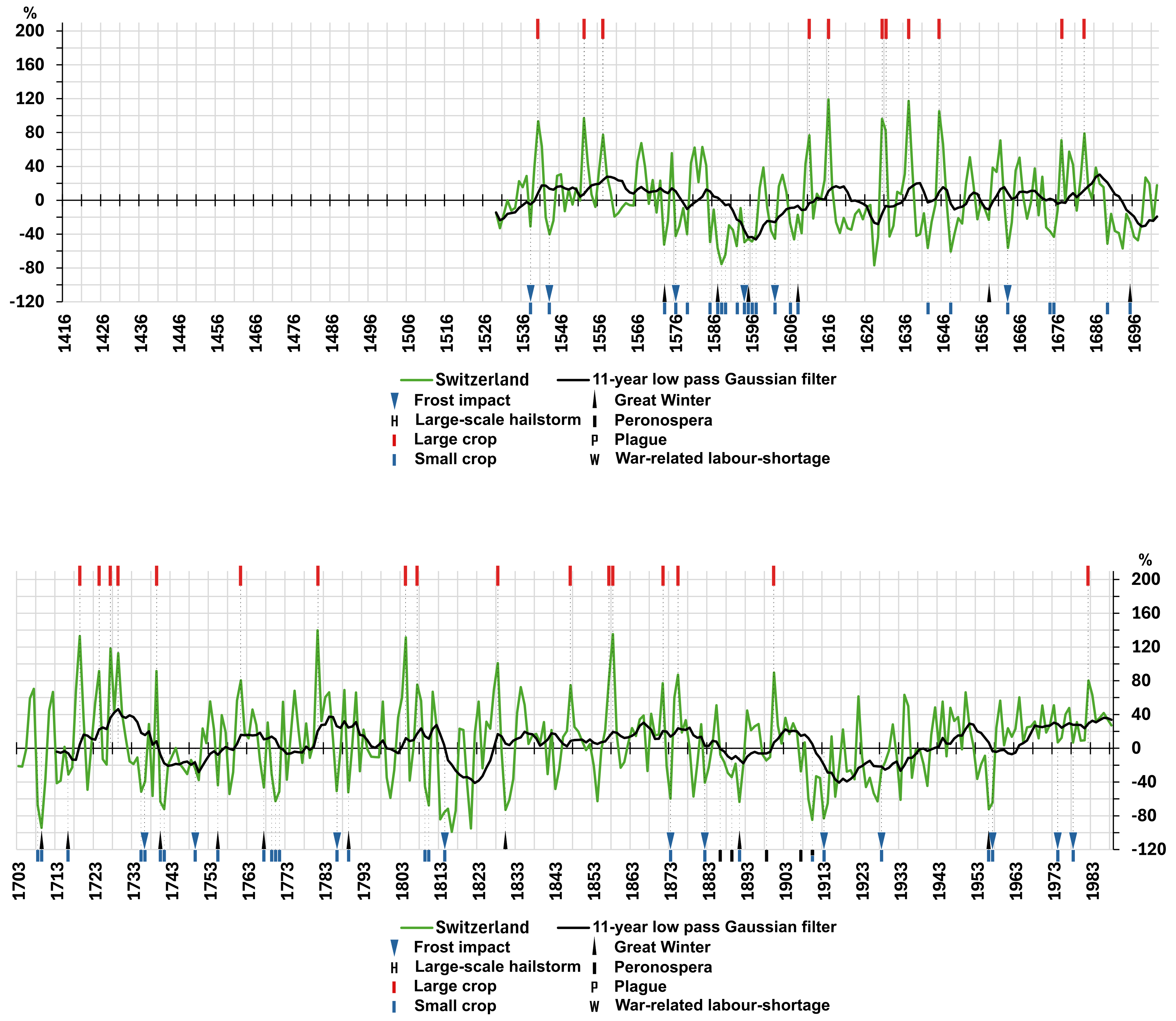 Figure 6 presents the supra-regional Swiss Plateau series covering the period from 1529 to 1988 as a percentage of the mean. After a poor crop yield in 1529, yields rose to a bumper harvest in 1540 and then alternated above average until 1557. A longer-term decline in yields began in 1558, accelerating in the early 1570s. After a brief warm spell from 1580 to 1584, winter and spring frosts, superposed by cold summers, affected the vines until 1602. From 1603 to 1617, yields increased, culminating in a bumper harvest in 1616. Over the subsequent 13 years, yields mostly remained below average. Bumper harvests in the 1630s ushered in a period of great variability that lasted until 1688. The following decade was marked by severe frosts and cold summers with poor harvests. The period from 1718 to 1731 stands out with four bumper harvests and three above-average yield years. Between 1740 and 1811, above- and below-average harvests alternated, especially during a cold spell from 1769 to 1773. The early 19th century was characterised by a series of poor harvests between 1812 and 1817 and again between 1830 and 1833. Apart from a dip between 1888 and 1891, yields moved around average until 1908. Only three harvests were satisfactory between 1909 and 1928 due to the weather and downy mildew (Plasmopara viticola) disease (Altwegg, 2023). Apart from a severe crop failure due to winter frost in 1956 and a severe spring frost the following year, yields fluctuated above average until 1988, including two large harvests in 1982 and 1983. No further records of spring frost are available.