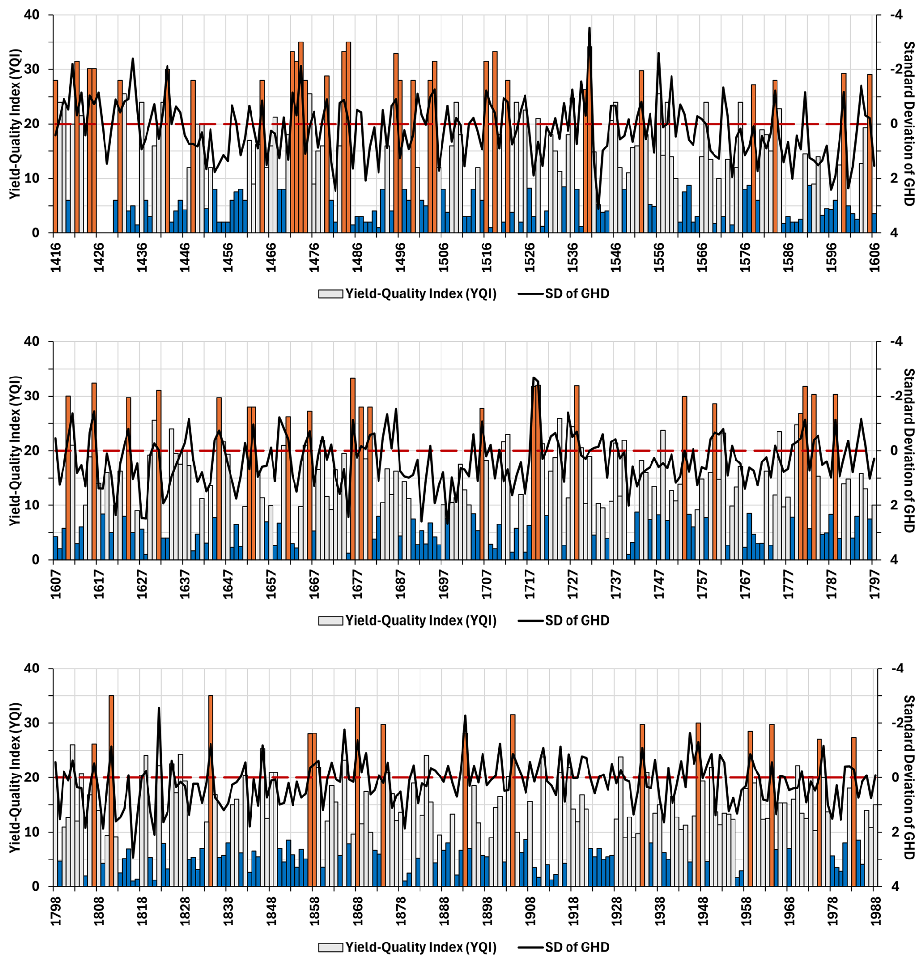 Figure 7 presents a visual agreement between YQI and GHD. The red columns show “good harvests” with YQI > 70. The blue columns show “small harvests” with YQI < 10. “Good harvests” were frequent between 1416 and 1425, 1471 and 1473, 1539 and 1540, 1677 and 1681, as well as 1857 and 1858. This relationship is broken down in more detail in Table 5.