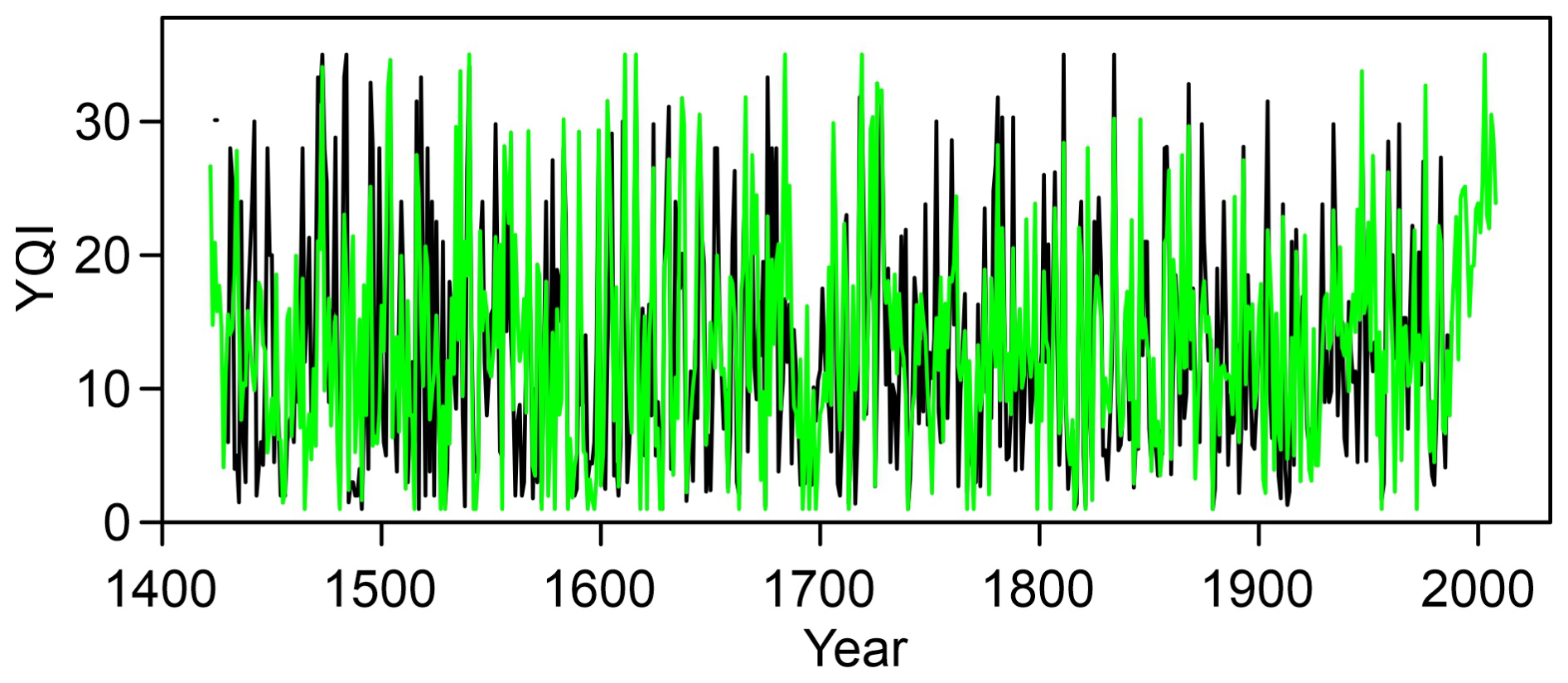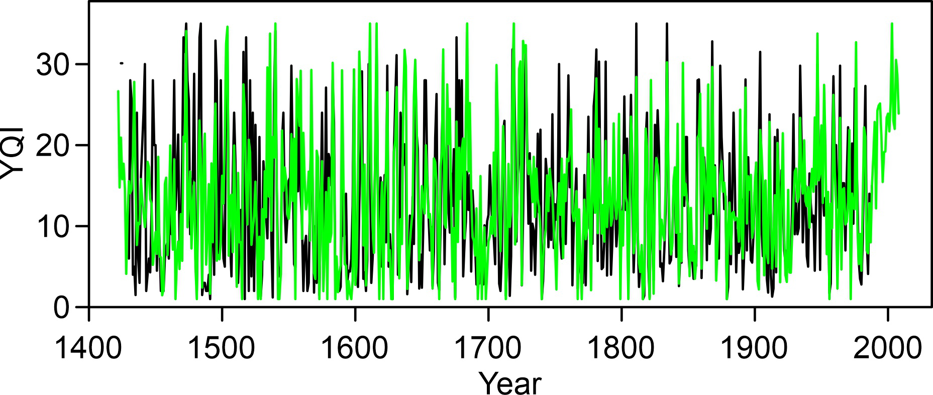 Figure 8 shows the modelled and observed YQI series from 1421 to 2008. For this figure, the modelled series was cut at the minimum and maximum values, i.e. at 1 and 35. The figure confirms the excellent agreement, with correlations of 0.87 in the calibration period and 0.60 over the entire period back to 1421. The YQI could be constructed further back in time and then used for climate reconstruction.