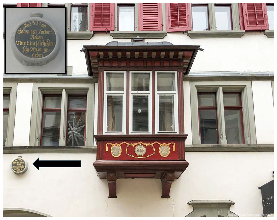 Figure 10Composite photograph of a memorial epigraph displayed at the “House of the Bottle” Spisergasse 11 in St. Gallen (Switzerland). Copyright: Hans Fässler, St. Gallen.