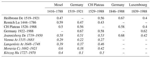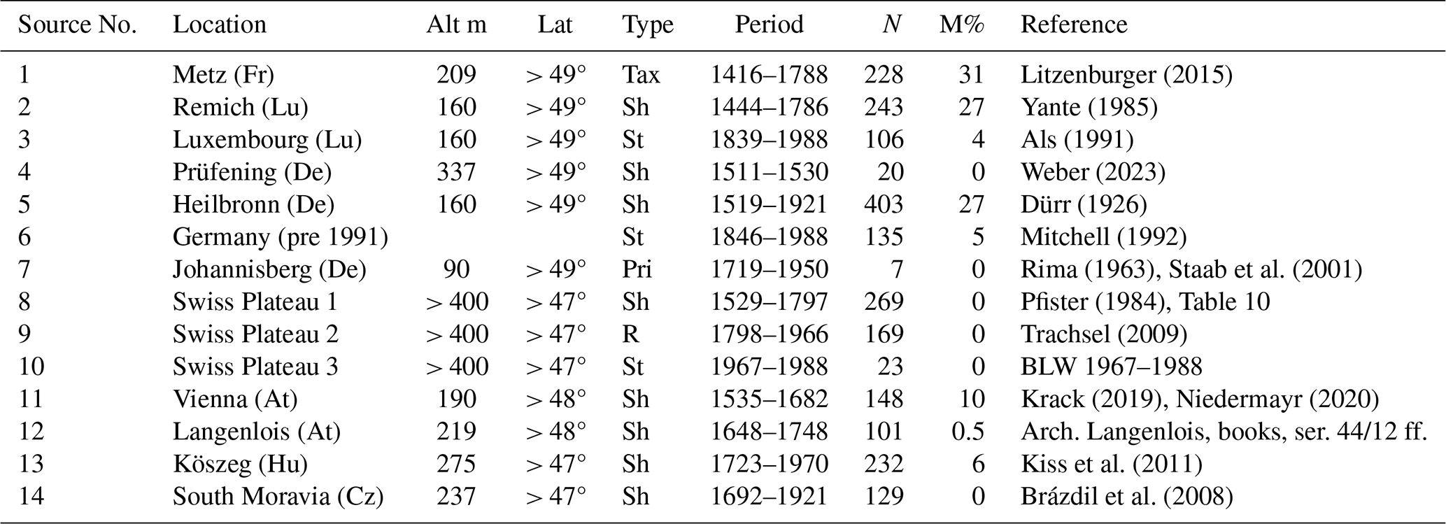 Legend: At = Austria; Cz = Czech Republic; CH = Switzerland; De = Germany; Lu = Luxembourg; Hu = Hungary. Data: Southern Moravia: Brázdil et al. (2008). Italics: supplementary evidence.