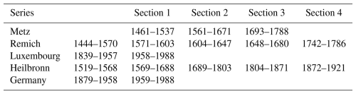 A comparison of the yields from 1473 to 1475 with those of the small town of Remich (Fig. 1, Table 1, source 2) reveals a significant disparity, likely attributable to the siege laid on the city by Duc Nicolas I de Lorraine-Anjou in 1473. Consequently, the percentage values of Remich were employed for the corresponding years in the nearby Metz series (Fig. 1). Likewise, the values for the period between 1538 and 1561 were absent from the archives after Metz was conquered by the French (Klipffel, 1867). They were supplemented by the respective percentages of the Remich series, as well as further gaps in the years 1500 to 1502, 1521, 1530, and 1574. The conquest of the city by French troops in 1646 during the Thirty Years' War (1618–1648) decimated the population (Trapp et al., 2021). From then on, there was a shortage of skilled labour. Starting in 1671, crops were only sporadically recorded. In 1678, the records stopped altogether. Fifteen years later, the records resumed, but yields were at a lower level, which persisted until the end of the ancien régime in 1788.
