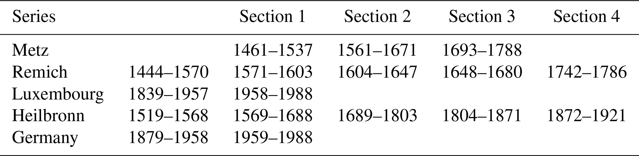From 1416 to 1988, 11 regional wine must yield series were compiled from the French-Luxembourg Mosel region, parts of Germany and the Swiss Plateau. The cities of Metz, Remich and Heilbronn are located above 49° N, while Vienna is situated at 48° N; the Swiss Plateau is located slightly farther south (Table 1).