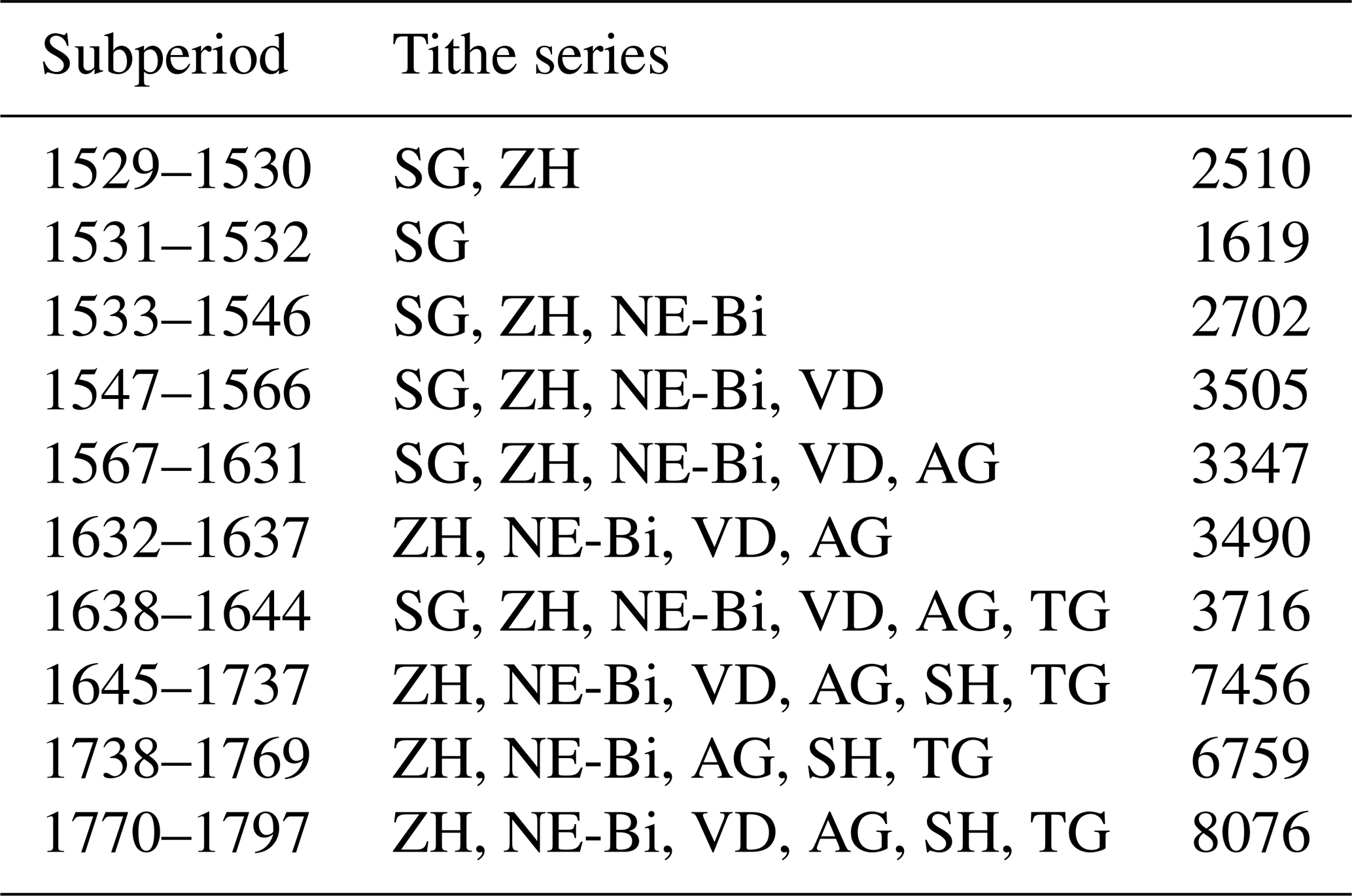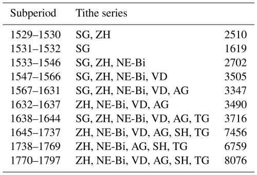 The regional series Swiss Plateau 1 (Table 1, source 8) is based on an estimation of wine must production between 1529 and 1797, using the vine tithe, the second most important feudal tax after the grain tithe (Pfister, 1984, Annex). The grape varieties largely coincided with the linguistic and cultural boundaries. The white Chasselas grape was widespread in French-speaking western Switzerland, while traditional white varieties such as Elbling and Räuschling were common in the German-speaking cantons further east. Following the Reformation, the ecclesiastical estates in the Protestant cantons, along with their vineyards, became the property of the secular authorities. During the grape harvest, either the tithe payers poured the harvested grapes into an official wine press or a sworn overseer ensured that the 10th bucket was always emptied into an official tithe barrel (Pfister, 1981). After the dissolution of the ancien régime in 1798, tithes were abolished by canton in the following decades (Dubler, 2015). The Swiss Central Plateau regional series is divided into 10 sub-periods according to their different regional composition (see Table 2). A separate linear trend with residuals has been calculated for each canton.