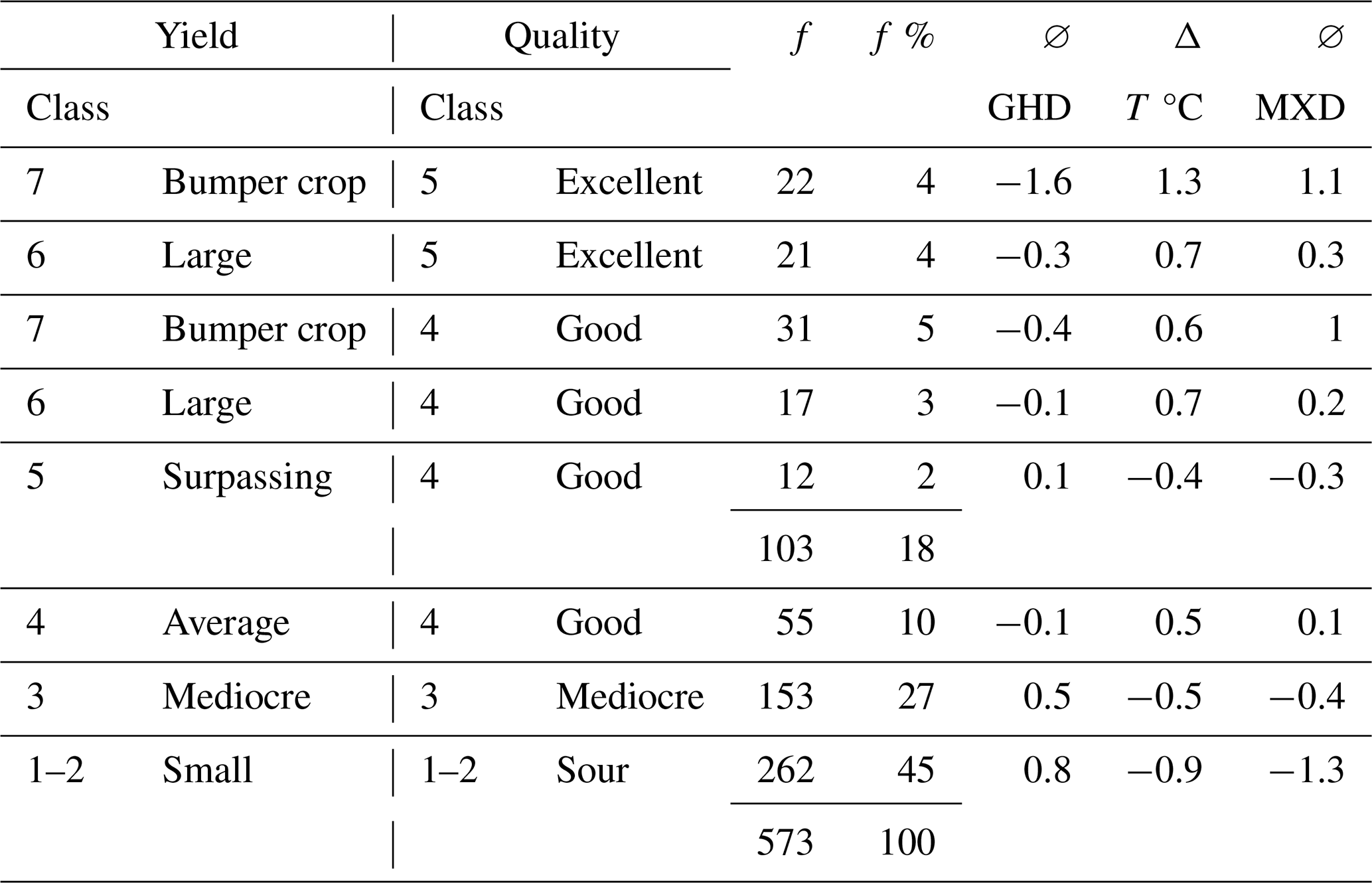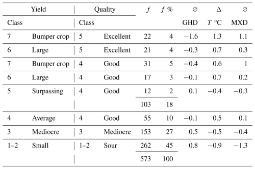 Table 5 shows that 18 % of the grape harvests can be qualified as “excellent” or “good” and 10 % as quantitatively above average and of good quality; 27 % were mediocre, and 45 % “poor” and “sour” or “undrinkable”. Qualitatively and quantitatively “good” harvests went hand-in-hand with above-average summer temperatures, above-average to early GHD and above-average tree-ring maximum latewood density (MXD). However, this connection needs to be broken down in more detail (Table 6).