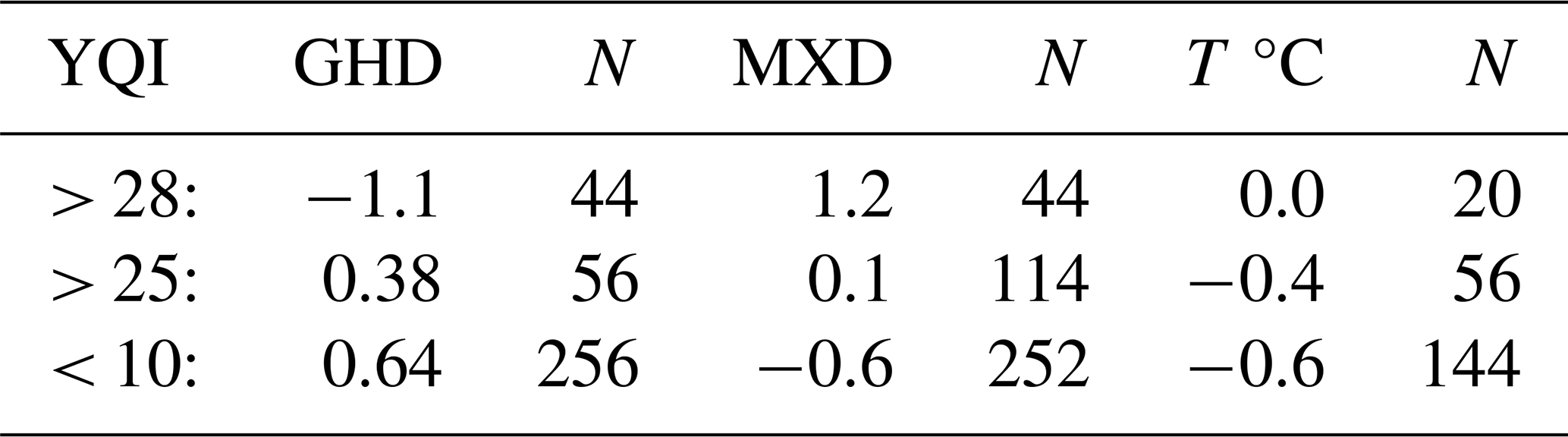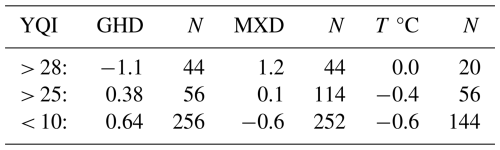 Table 6Range of YQI related to proxy data and May to July temperatures.