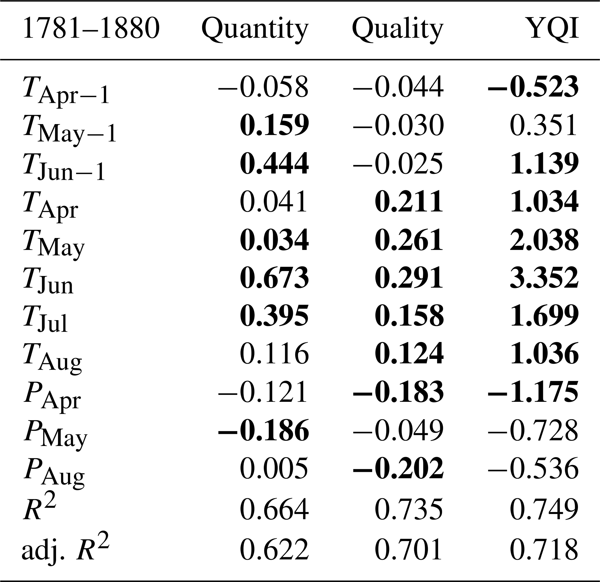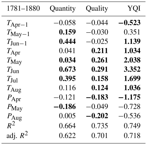 Table 7Coefficients (units per °C for temperature, units per 105 mm per month for precipitation), explained variances and adjusted explained variances of regression models for quantity, quality, and the YQI calibrated in the 1781 to 1880 period (bold: p < 0.05).
