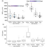 It is evident that a significant change in climate, vegetation, and fire regime occurs at the western most Worley Lake. Estimated MAPDWHI increases from 1340 to 3170 mm between the early- and late-Holocene, respectively (Fig. 7a). The early-Holocene pollen record (Bone et al., 2026d) at Worley Lake is characterised by P. menziesii (3 %–20 %) at ca. 10 000 cal yr BP, along with abundant Alnus (32 %–62 %). Tsuga heterophylla (0 %–22 %) increases sharply after ca. 9000 cal yr BP, signalling that climate driven changes in forest composition and structure may have been occurring earlier in the western part of the study region (Fig. 6a). Both Swanson and Worley Lakes had comparatively underdeveloped shrub and herbaceous layers, implying that western forests were less open than contemporaneous eastern forests. Evaluation of charcoal analysis (median SNI = 4.9) for the early-Holocene record (Bone et al., 2026c) produces thirteen positive fire-related peaks (Fig. 6b) and FRIs range from 87–377 years, with mFRI of 230 years (Fig. 8a). Peak magnitude is high and combustion of both heavier wood and lighter fuels (fuel morphotype index = 0.75) is occurring demonstrating potential for large, high severity, and/or localized fires at the site.